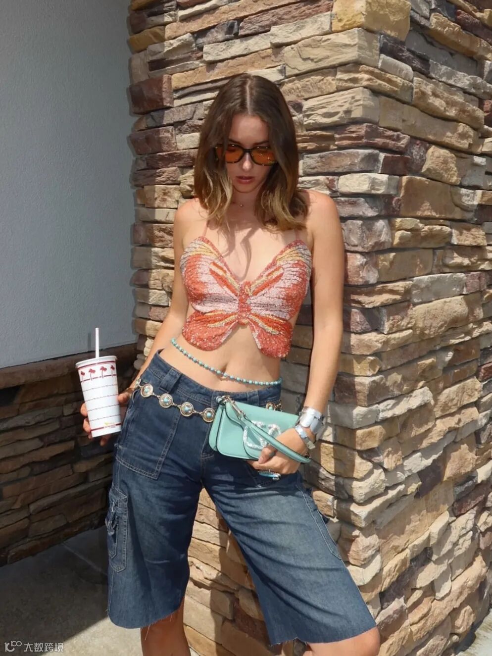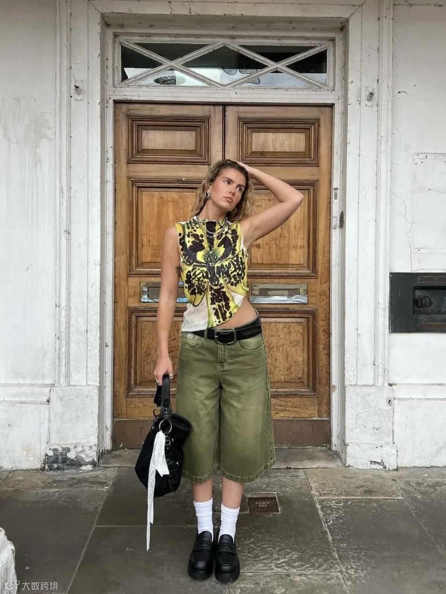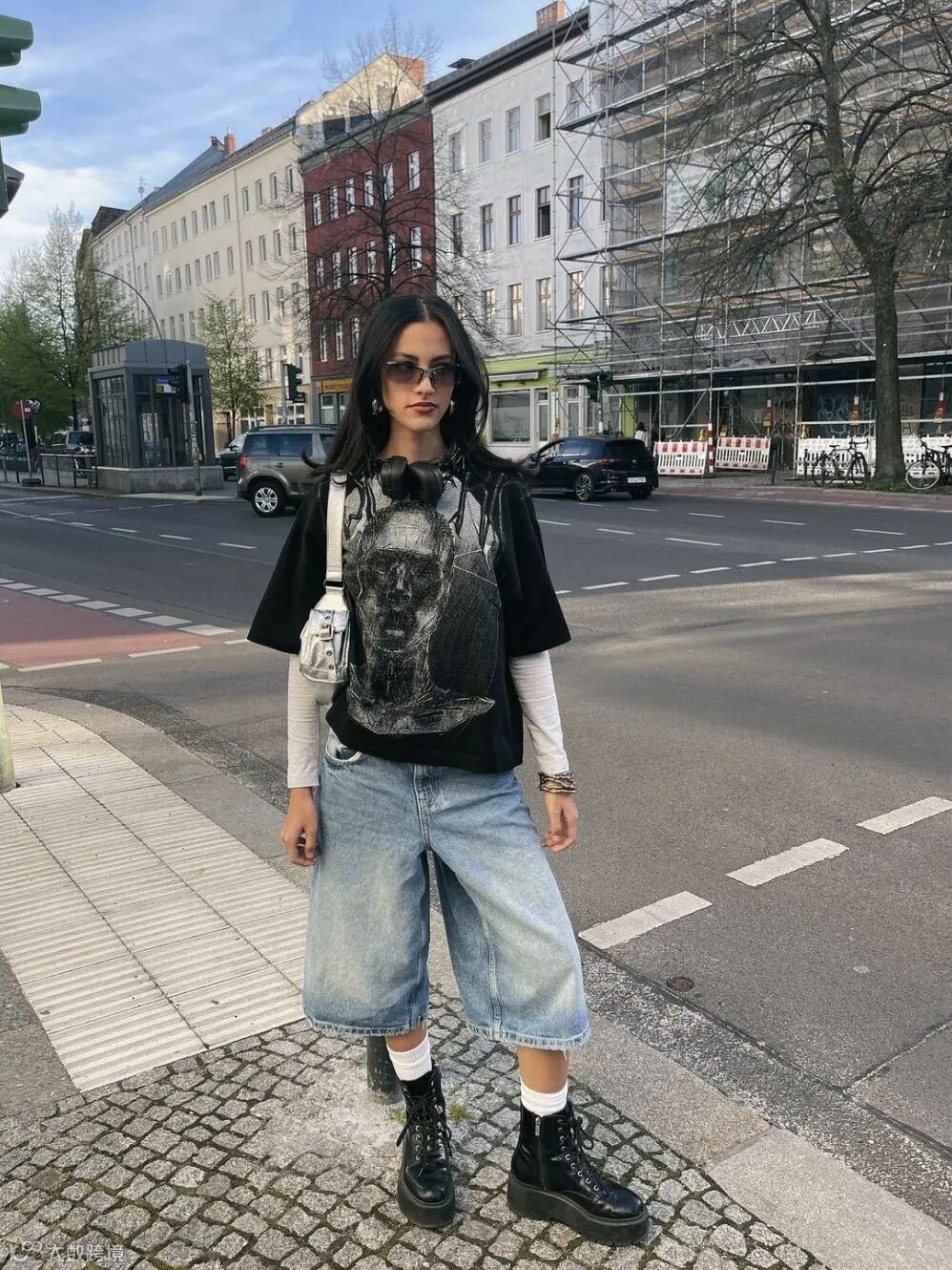 上衣可以尽量选择偏短加修身的版型,搭配Jorts一整个Y2K辣妹感。