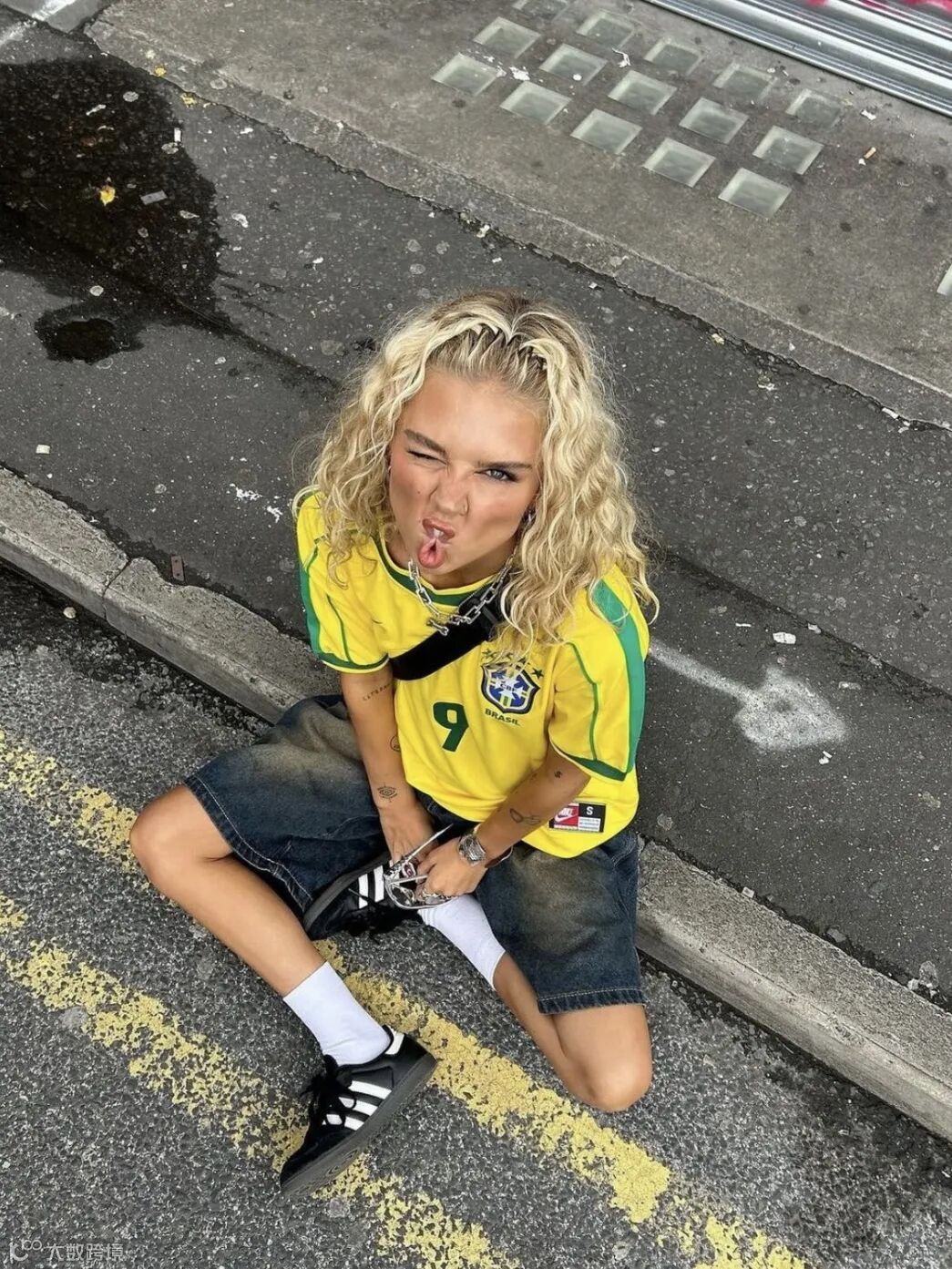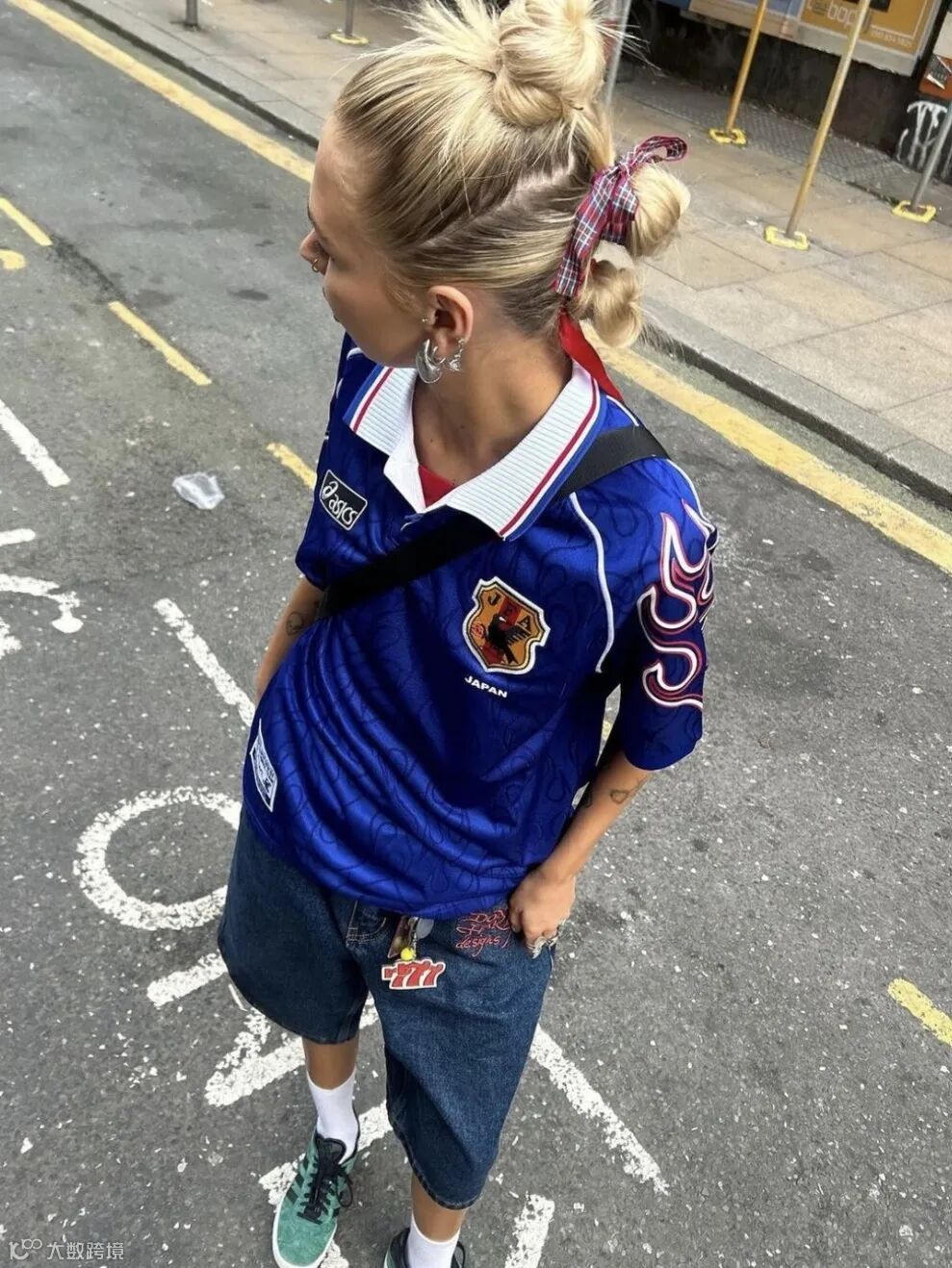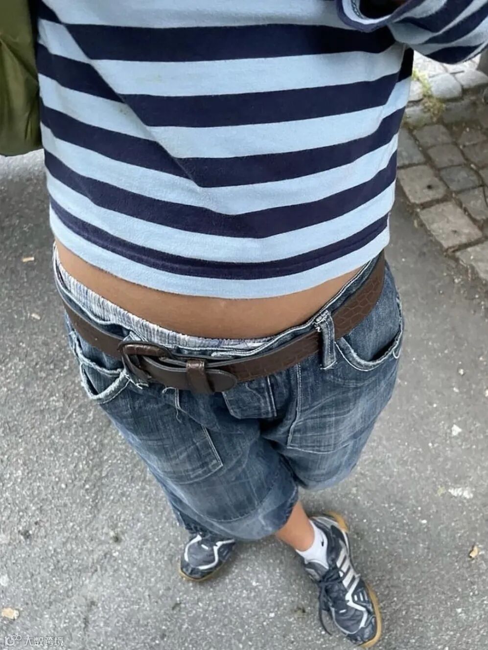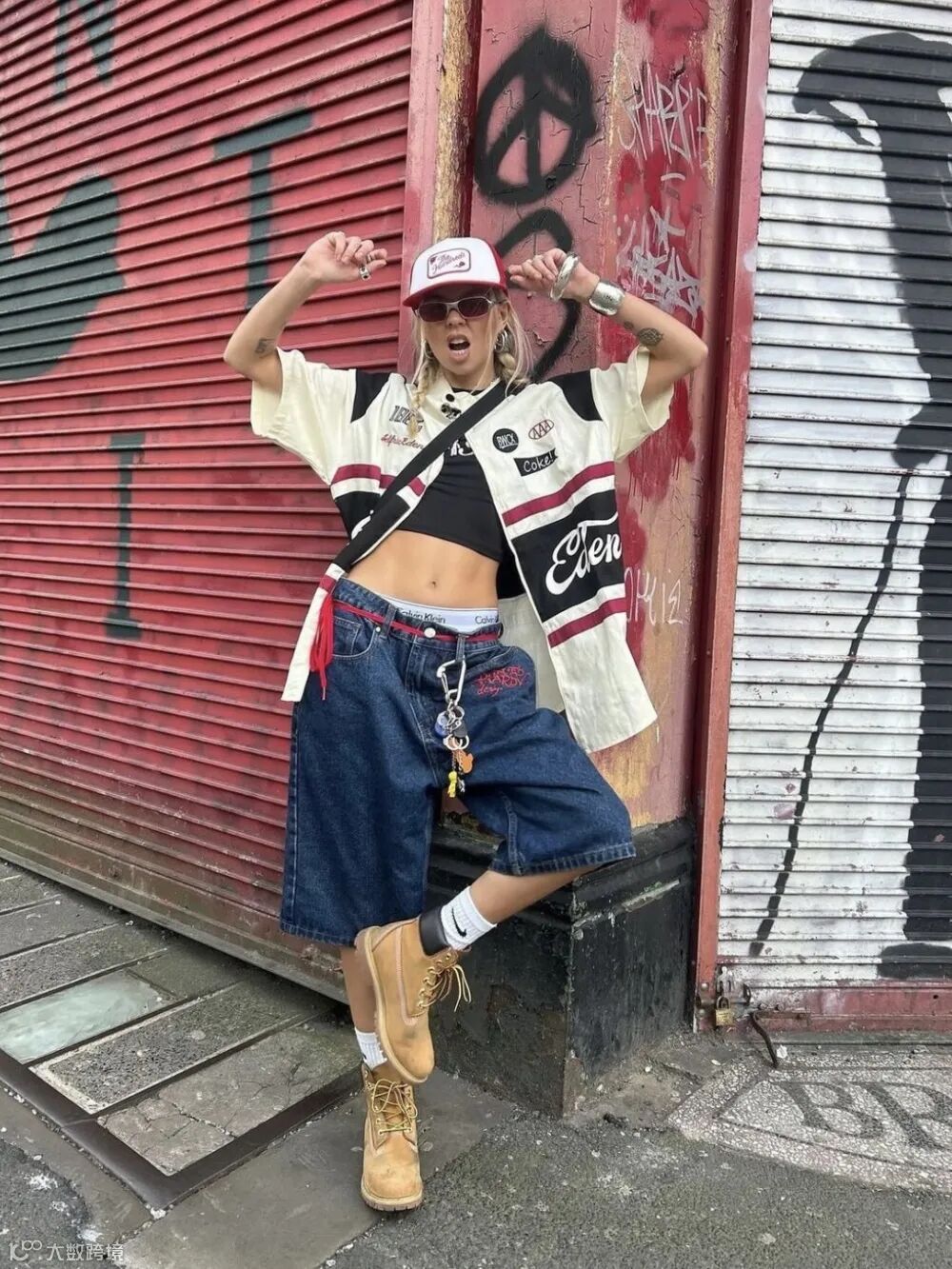 上衣可以尽量选择偏短加修身的版型,搭配Jorts一整个Y2K辣妹感。
