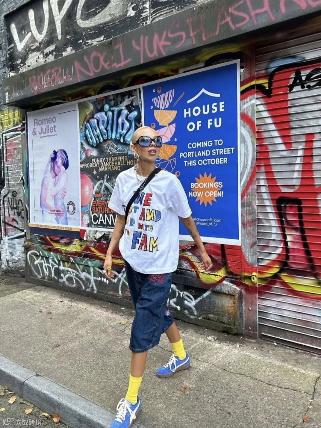 偏宽松版型的T恤搭配Jorts就更加有街头感了,给人自由舒展的感觉。