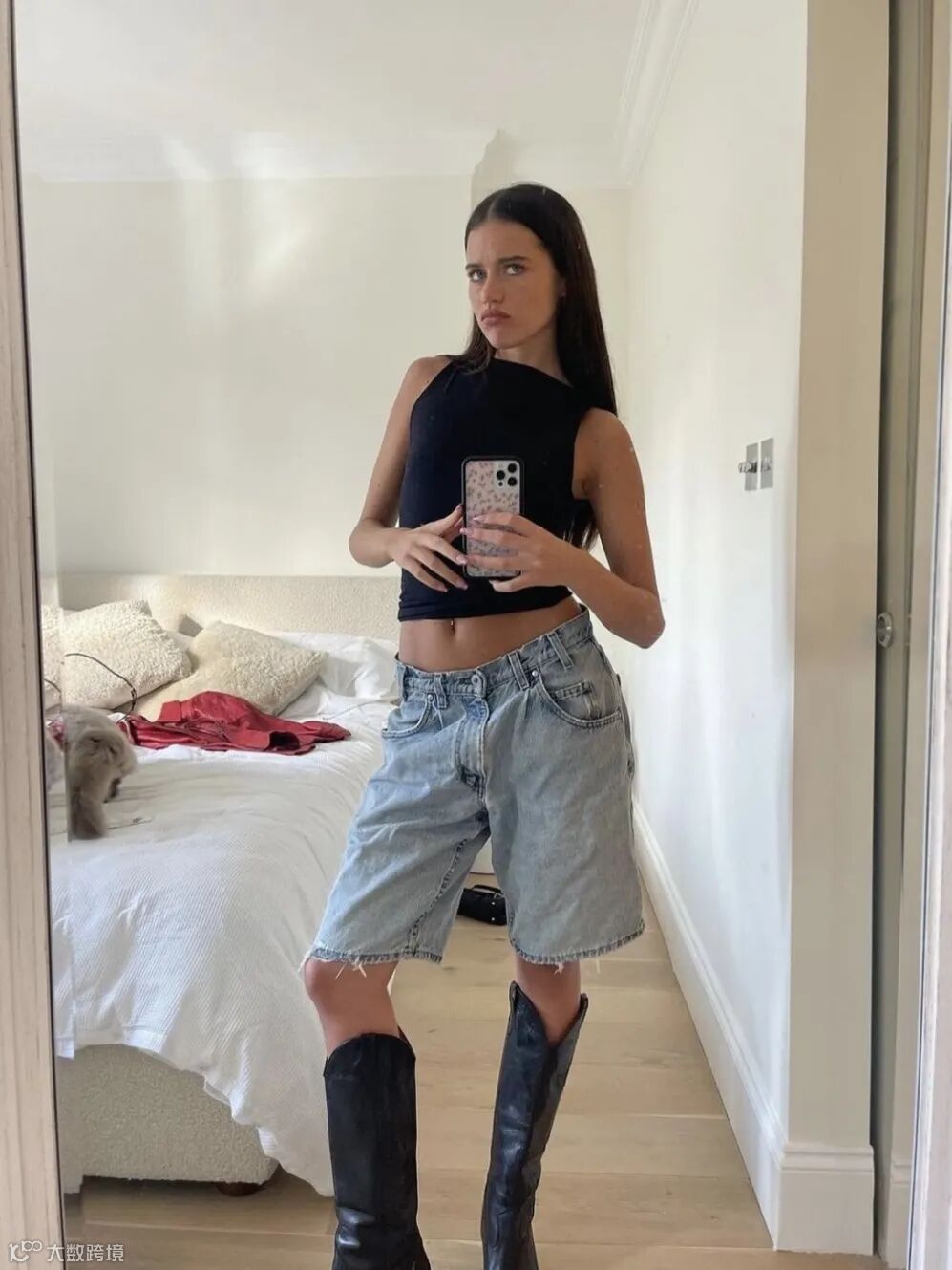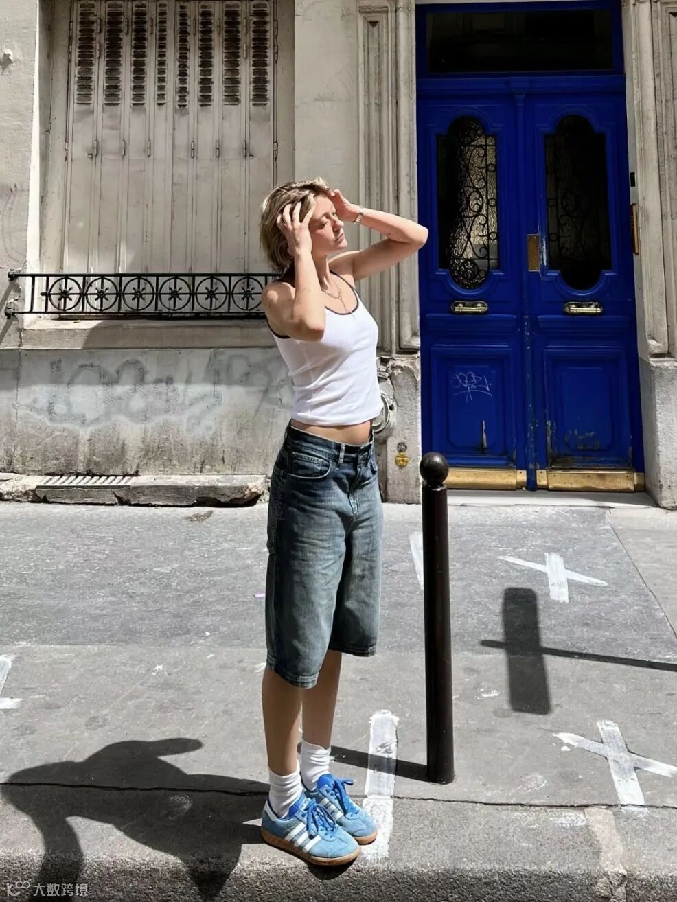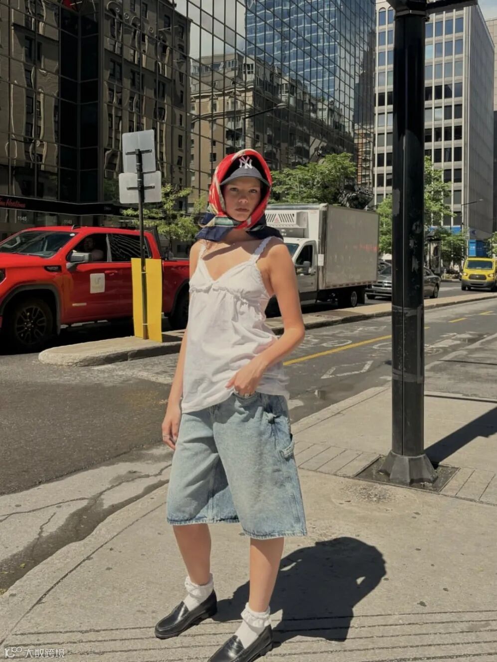 修身吊带搭配Jorts看起来少女感满满,随性又自在,属于辣妹夏日必备搭配。