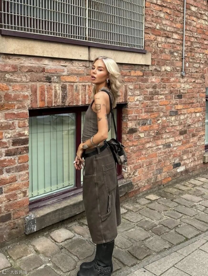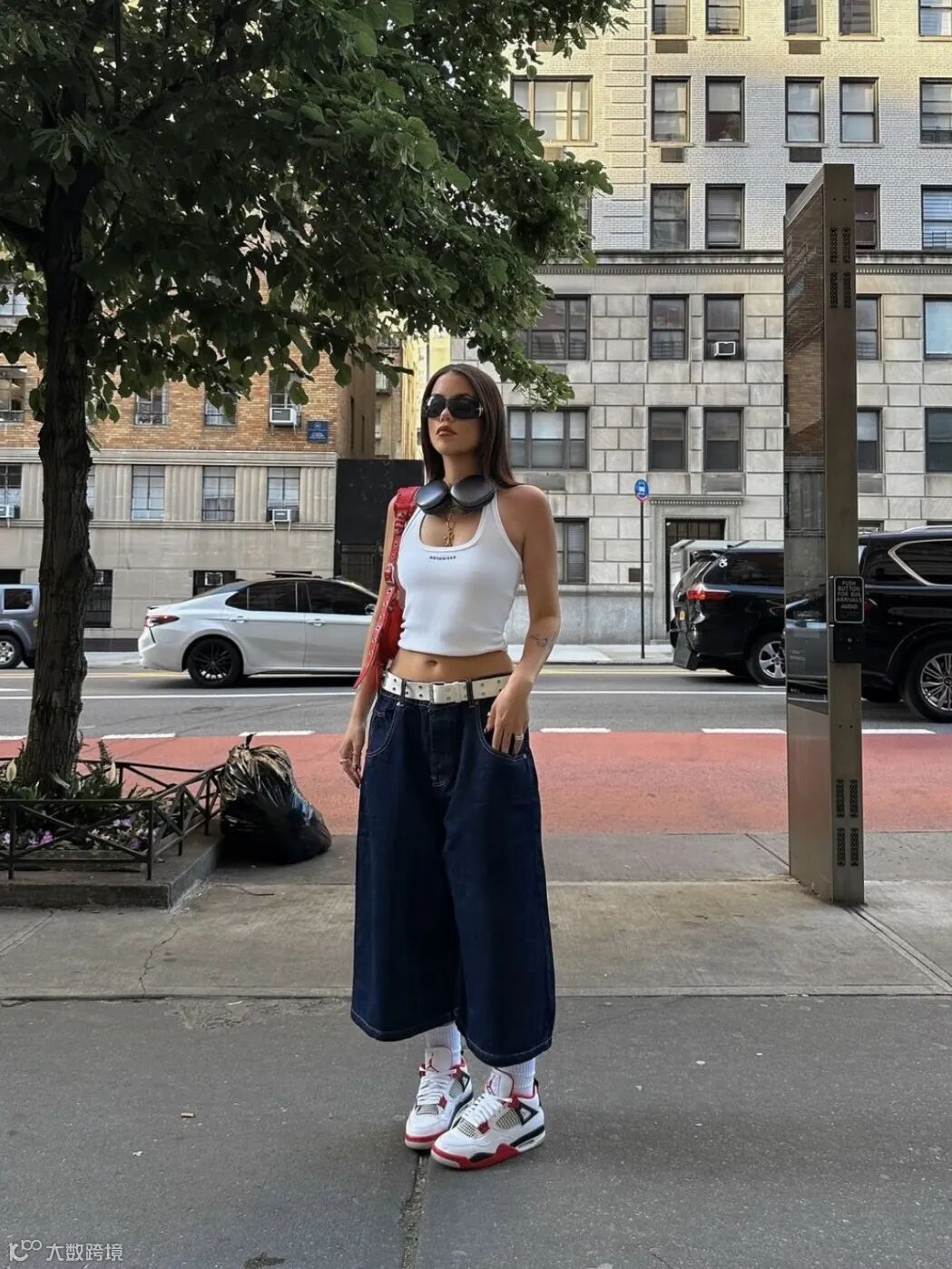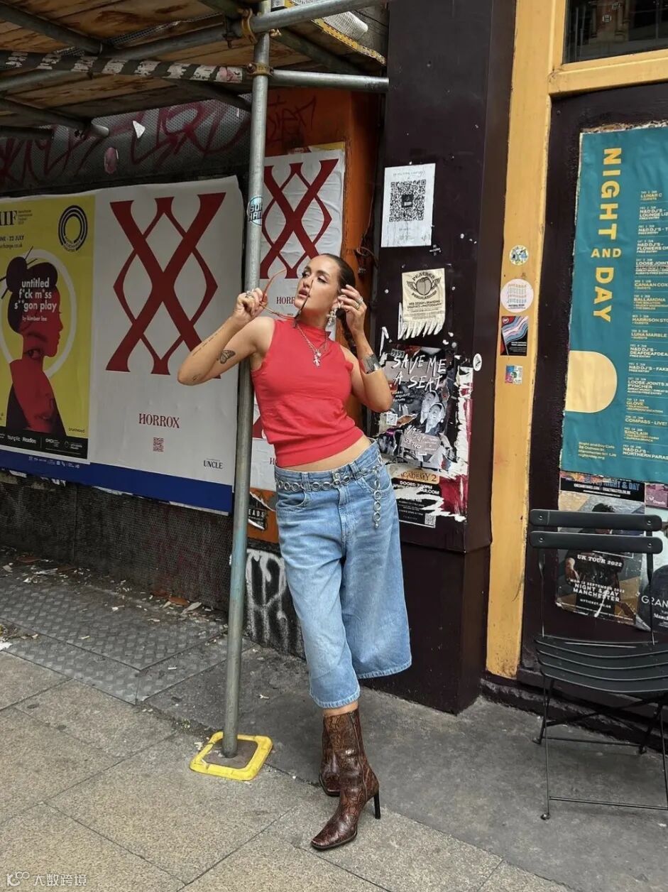 修身吊带搭配Jorts看起来少女感满满,随性又自在,属于辣妹夏日必备搭配。