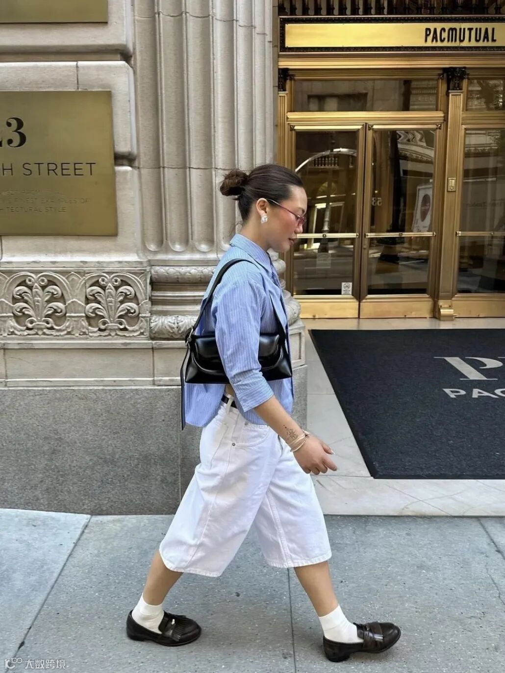 Jorts搭配长袖衬衫多了几分精致感,给人随性又克制的感觉,很有个人风格。