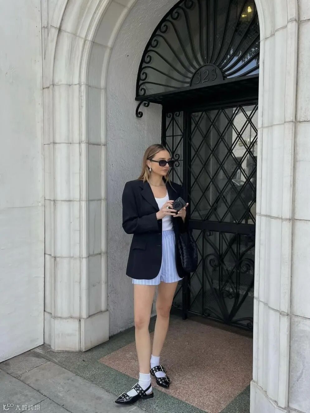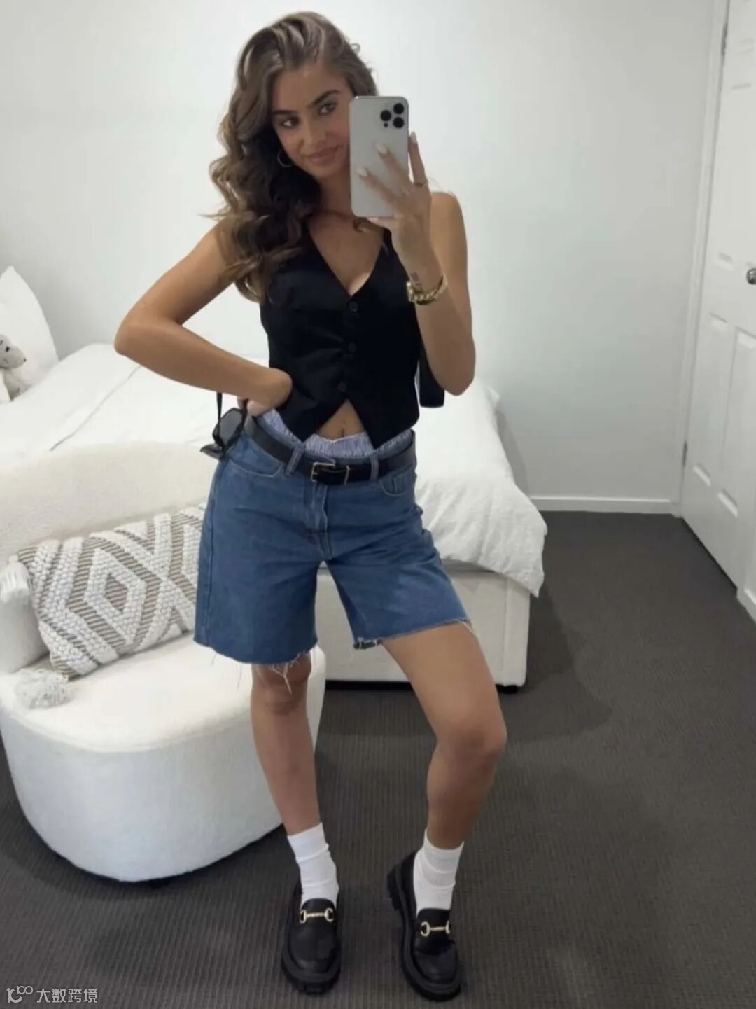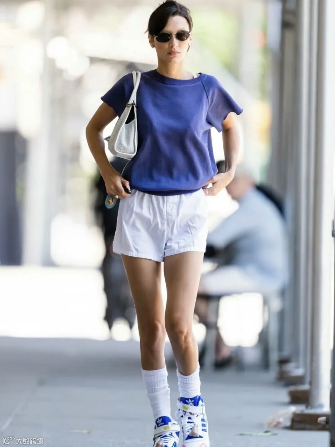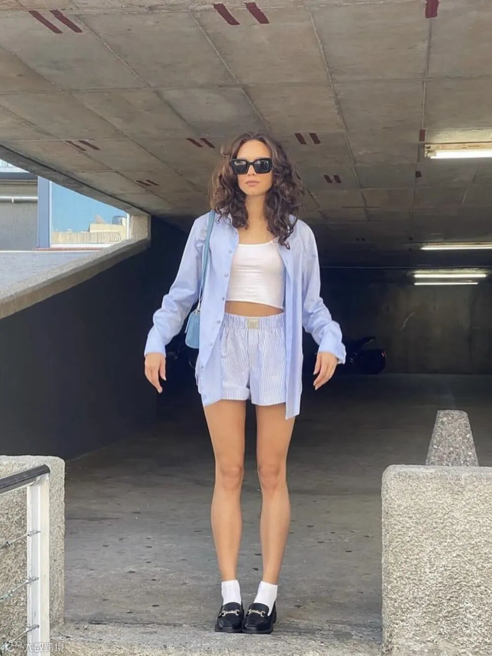 Bella Hadid、kendall Jenner等众多明星博主也早早穿上了Boxer Shorts,一整个美式辣妹既视感,搭配T恤和衬衫等单品,慵懒又随性。
