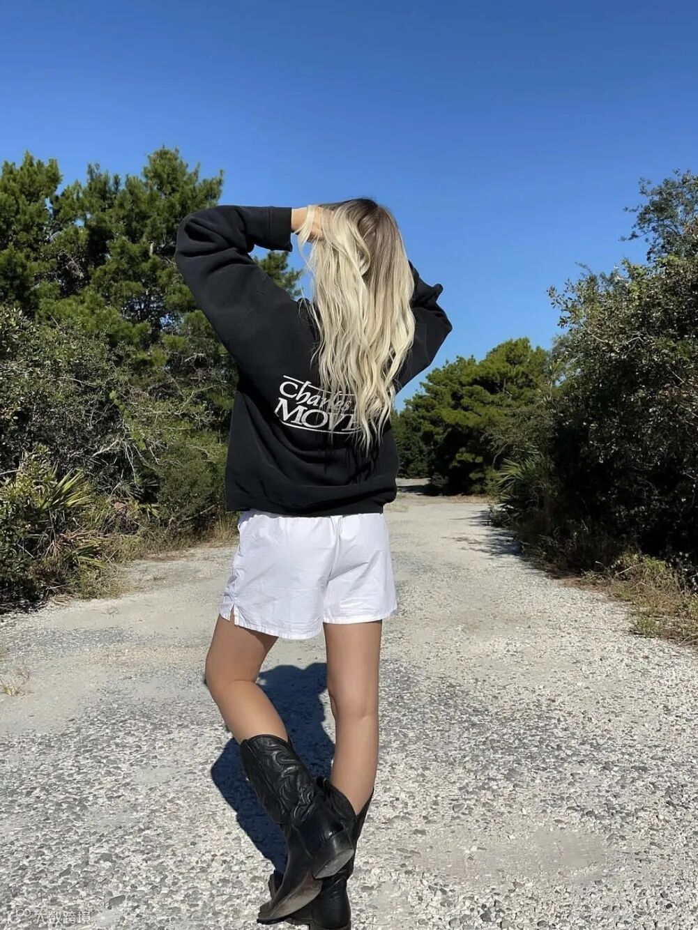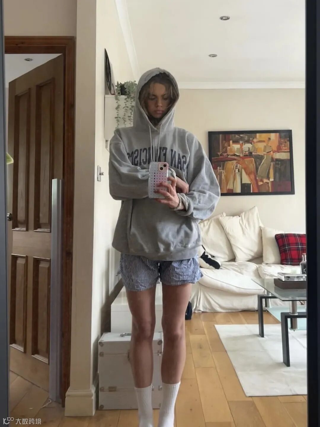 Boxer Shorts搭配卫衣是美式复古辣妹不能错过的一组搭配,露肤度感刚好,不会过于夸张,时髦感和舒适度兼备。