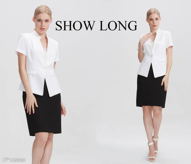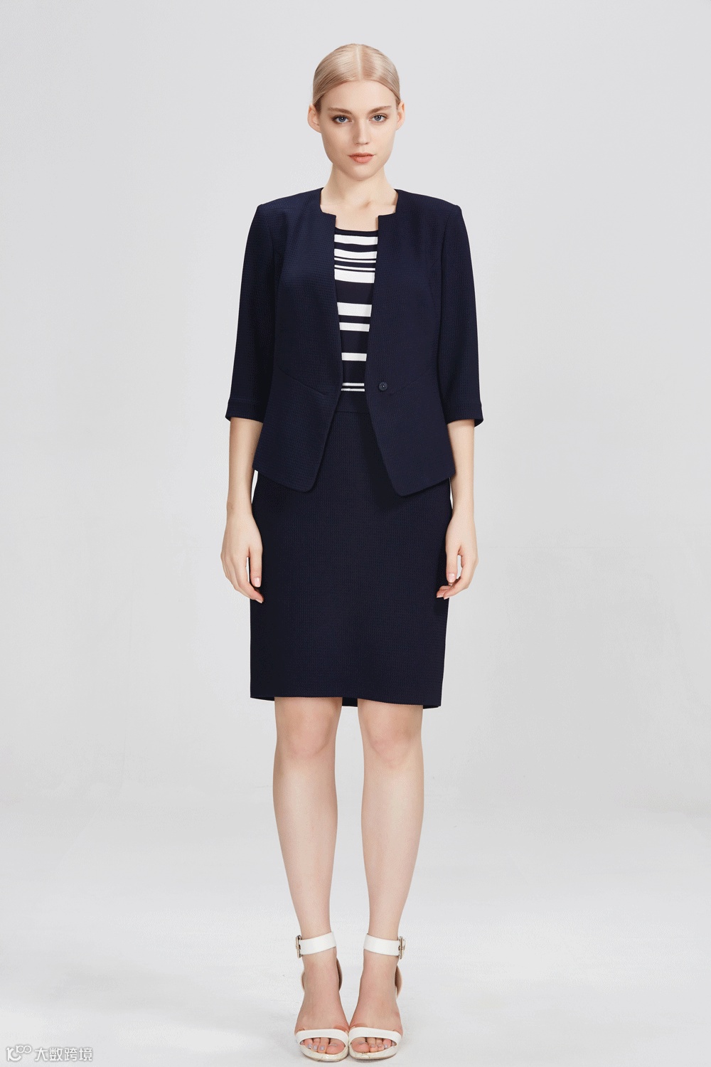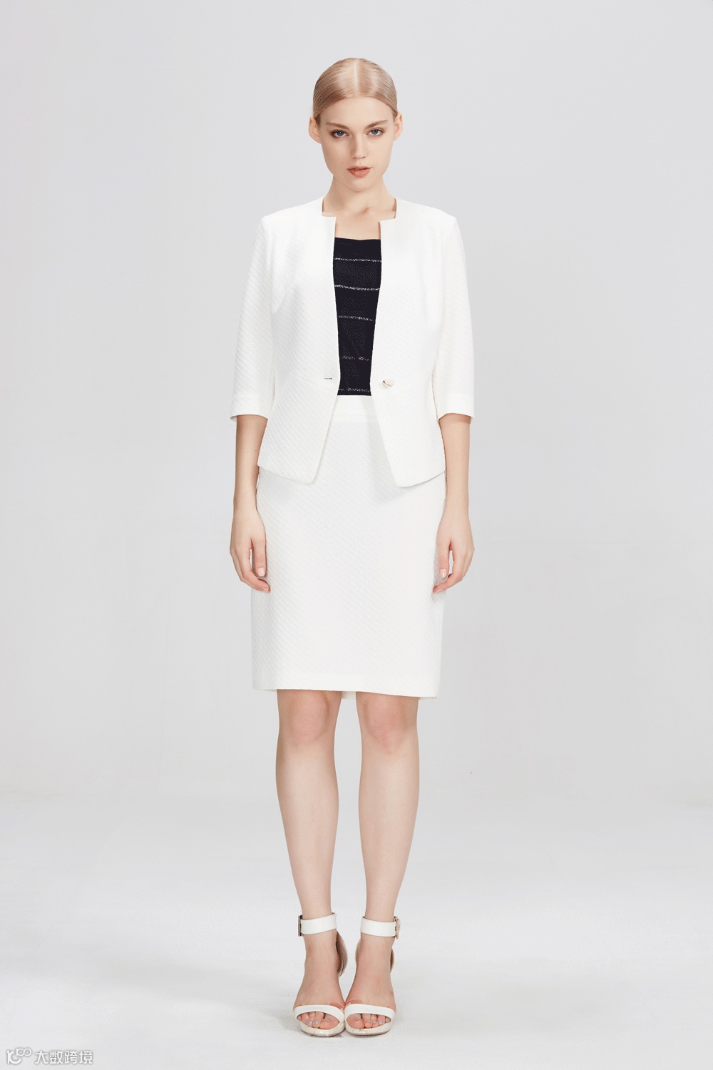 时尚的领型设计附着与简约大方的款式之上起到了画龙点睛的作用。修身的短裙突显职业女性的干练、迷人。