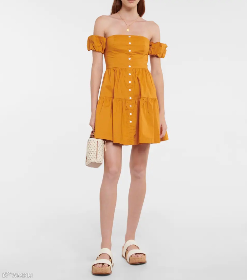穿上STAUD 这款“Elio”迷你连衣裙,展现热带风情。该单品甄选透气的黄色棉质府绸剪裁而成,搭配露肩泡泡袖、纽扣前襟与细褶分层式短裙。