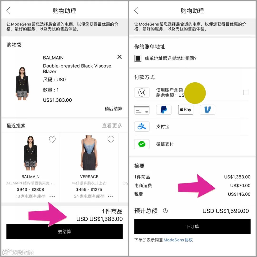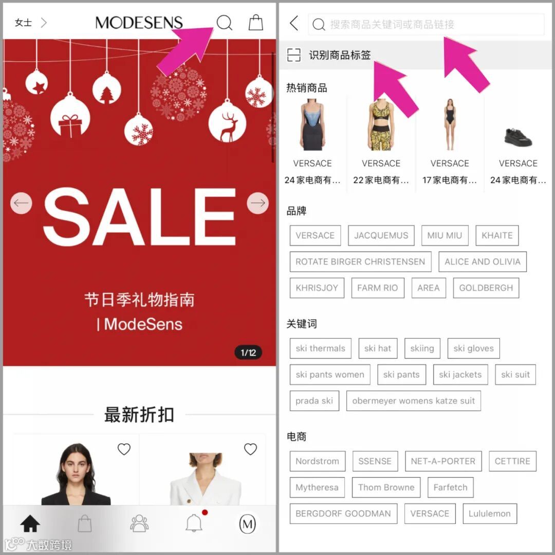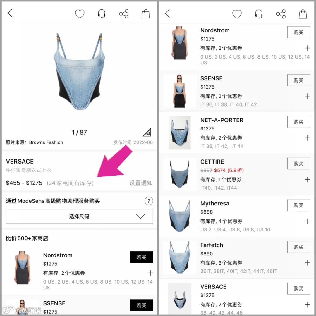 A:ModeSens目前有网站、APP、小程序,任一渠道访问都可以搜索商品,在商品页面可以直接点击“购买”跳转到国外电商下单,也可以在商品页面点击“通过ModeSens高级购物助理服务购买”委托ModeSens去电商代下单,代买0手续费,无溢价。均为电商直接发货,正品保证。