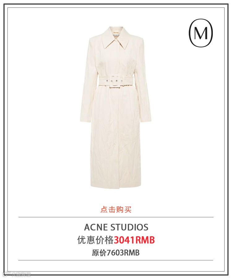 ACNE STUDIOS 这款大衣是跨季穿搭的时尚选择,甄选棉质斜纹布制成,呈现休闲的褶皱饰面,配有大廓形搭扣腰带。