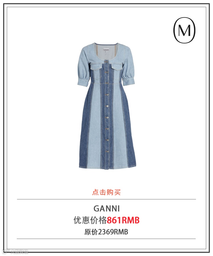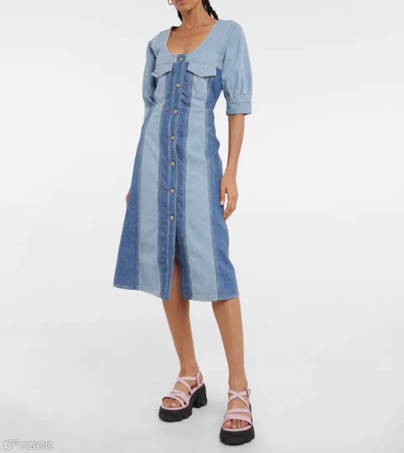 GANNI 这款中长连衣裙甄选两种蓝色调牛仔布拼接而成,采用微泡泡袖、低圆领和A字裙摆设计,在牛仔穿搭的基础上增添时尚的北欧风格。
