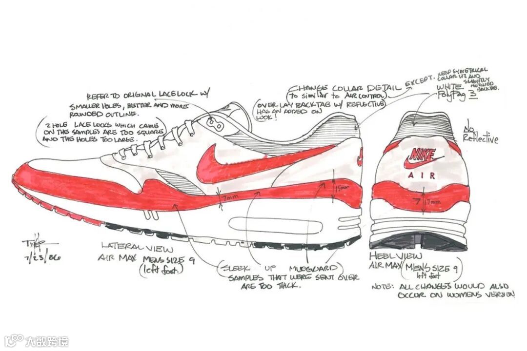 故事至此,关于到底哪个鞋款是第一款Air Max出现了不同的观点。一些人认为是Air Max Zero,因为它是第一款由Hatfield设计和提出的鞋款。另一些人则认为是1986年推出的Air Max “Big Bubble”。一方面,我们发现了当时的一张草图,因为技术还不够先进未能够实现。另一方面,由于气泡太大使得模型缺乏坚固性,在生产中出现了问题。