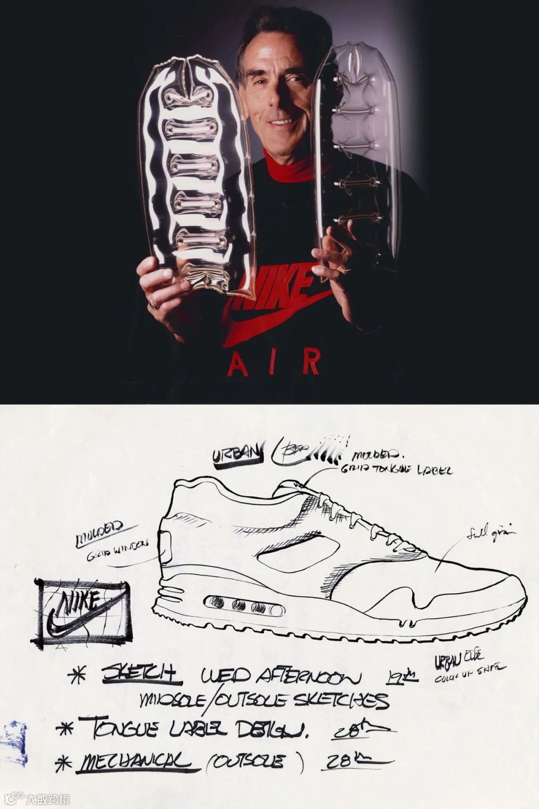 当工程技术不再足以对抗竞争对手时,Nike请来年轻的俄勒冈建筑师Tinker Hatfield为公司新园区设计办公室。从事建筑设计4年后,设计师决定将他的建筑研究应用到鞋履设计中。这一决定产生了意想不到的效果,不久后,第一款Air Max诞生了。
