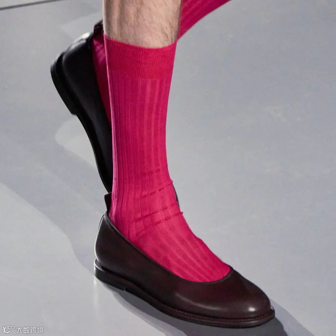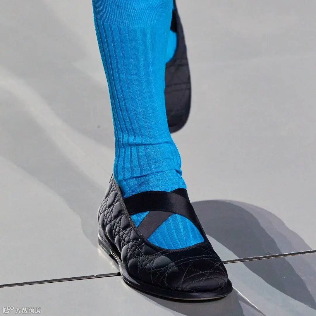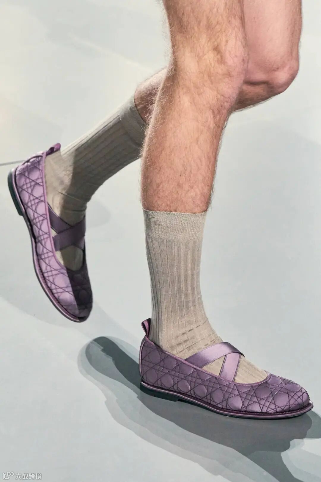 2024的Dior秋冬男装秀上演了一场以芭蕾舞者为灵感的时装秀。男模们穿着各式各样的芭蕾鞋,搭配各种高饱和度小腿袜,毫无违和感,展现绅士风度。
