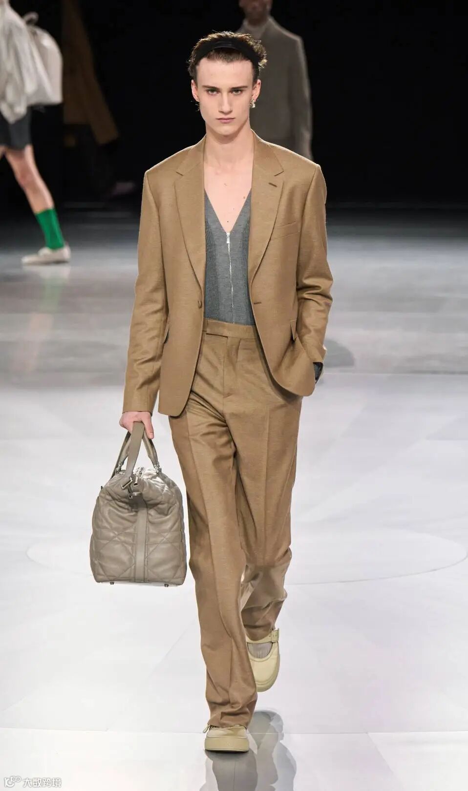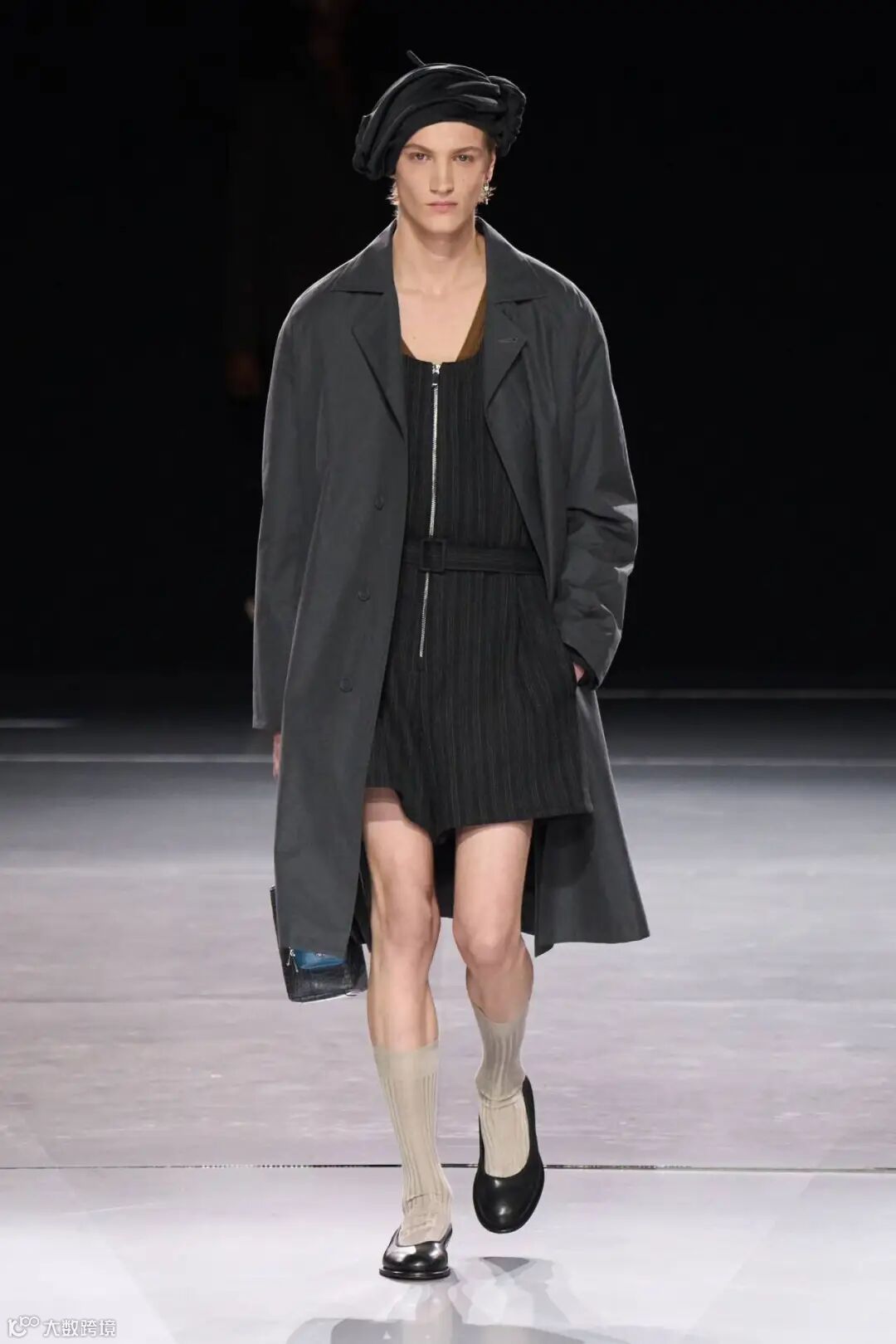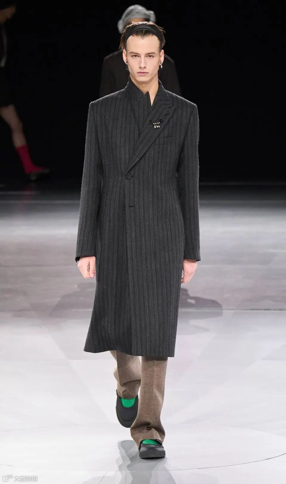 2024的Dior秋冬男装秀上演了一场以芭蕾舞者为灵感的时装秀。男模们穿着各式各样的芭蕾鞋,搭配各种高饱和度小腿袜,毫无违和感,展现绅士风度。