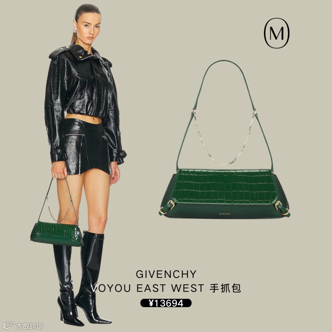 GIVENCHY East-West Bag亮面皮革搭配鳄鱼纹奢华贵气,肩带金属链条设计增加精致感。