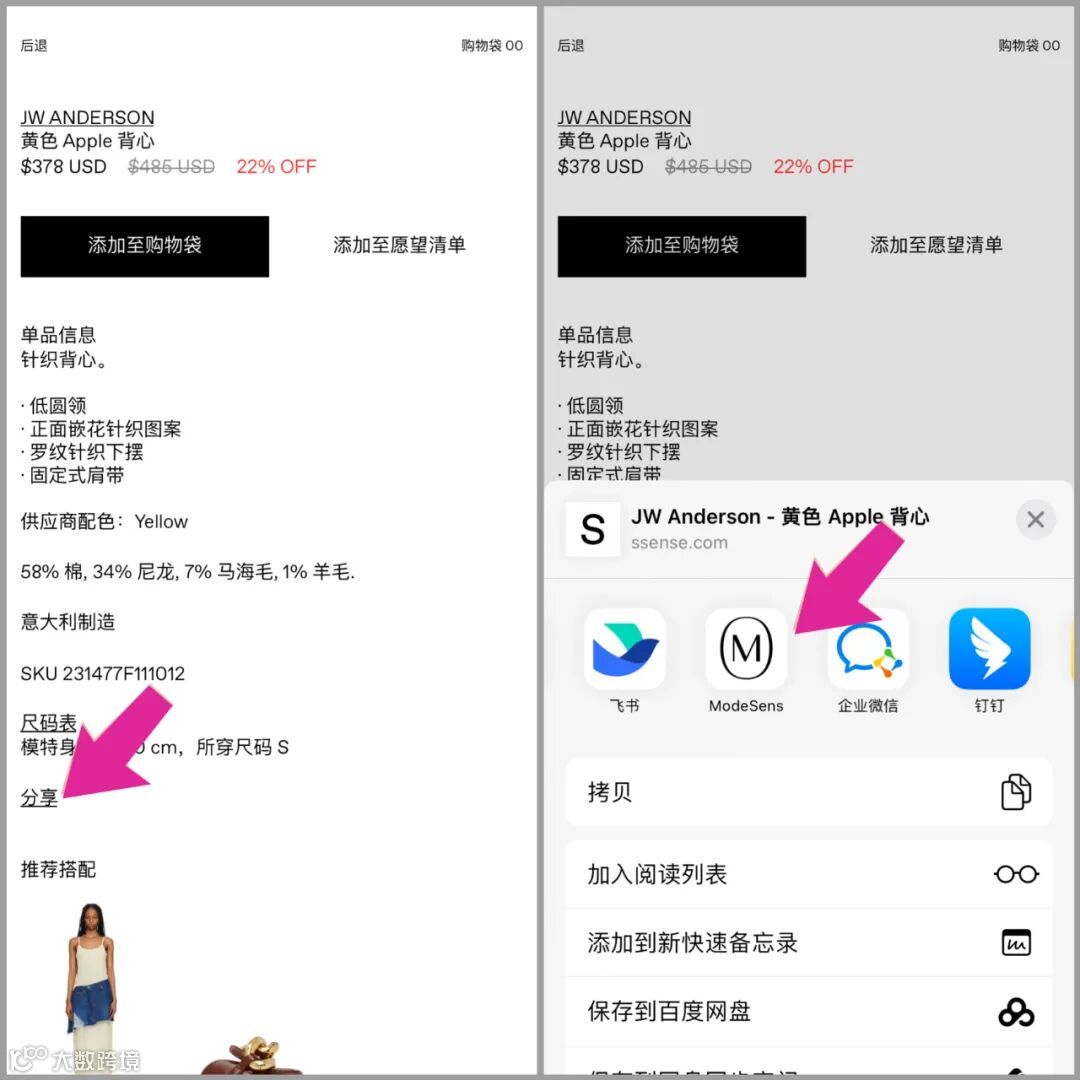 让我们向下👇滚动页面,找到分享按钮。点击分享按钮你会看到熟悉的ModeSens Logo,点击ModeSens Logo!