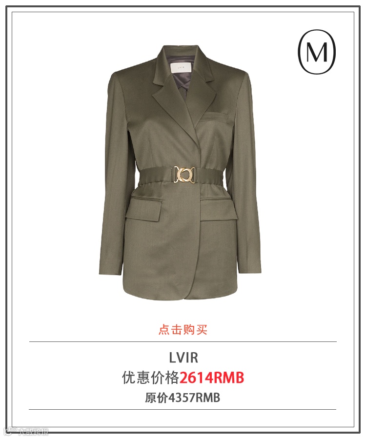 西装套装可以从色彩上做文章,苔藓绿自带清凉感。褶皱腰带在强化腰线的同时能够弱化西装套装整体的硬朗感。艺高人胆大的小姐姐一定要尝试「中空」穿着哦!