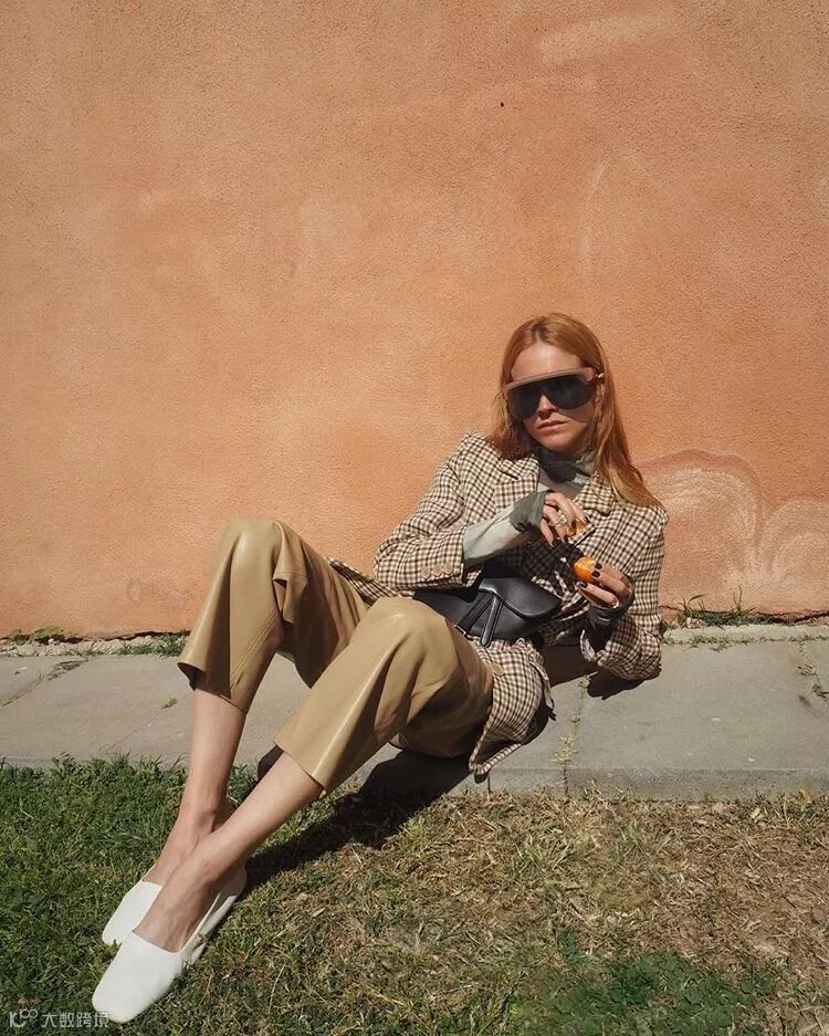 她总能将格纹与当季流行趋势所结合,将这一「复古元素」与当下最为流行的沙漠色系裤装搭配,引起极度舒适。