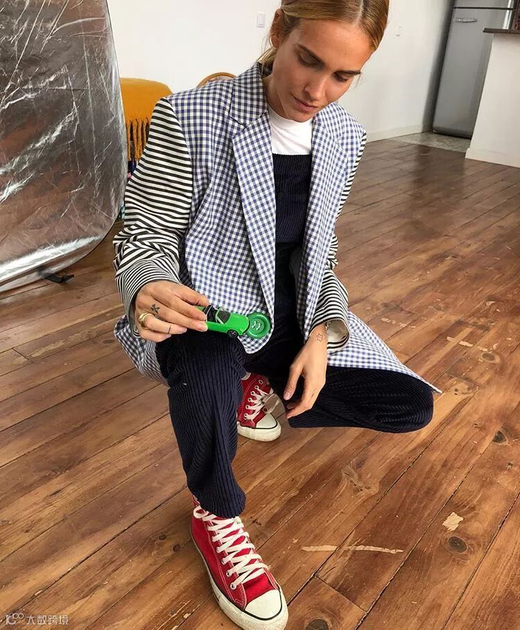 或是如邻家女孩般甜美的格纹连衣裙配上了叛逆少女的帆布鞋。在舒适的同时也有减龄的效果。