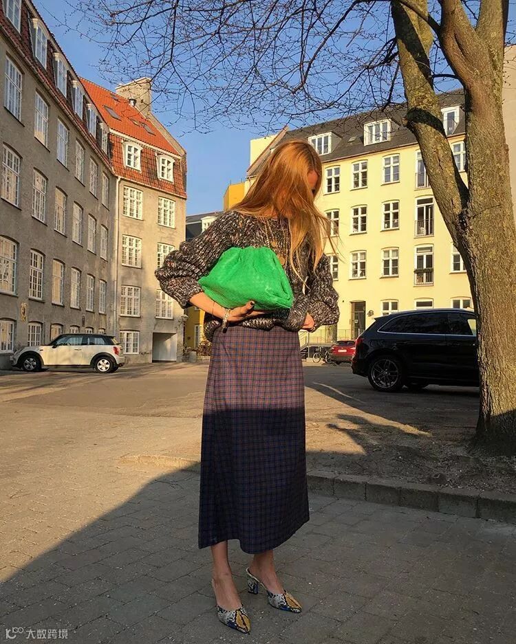 像是将看上去些许「质朴」的格纹半裙与大胆前卫的蛇纹穆勒鞋组合。但是一眼看去相信所有人都会被那只明丽绿色的BOTTEGA VENETA「云朵包」所吸引。害怕格纹老气不妨选一件夸张大胆的配饰与其相配。