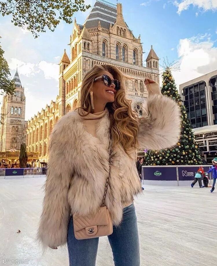 毛绒和牛仔拼接,也别有一番风味,复古味道十足,整体造型立体有质感,不管是上班还是出门逛街都很有腔调。