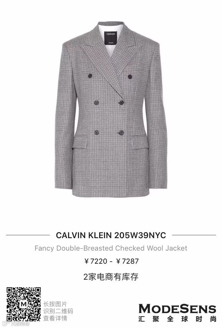 CALVIN KLEIN 205W39NYC 首席创意官 Raf Simons 在设计精裁单品时专门从华尔街金融人士的西装中汲取灵感。这款廓型西装外套,采用挺括羊毛于意大利制成,呈现出缩小版的格伦厄克特格子图案。Raf Simons 对美式风格的解读略带诙谐感,这件西服就是大写加粗的--时装。