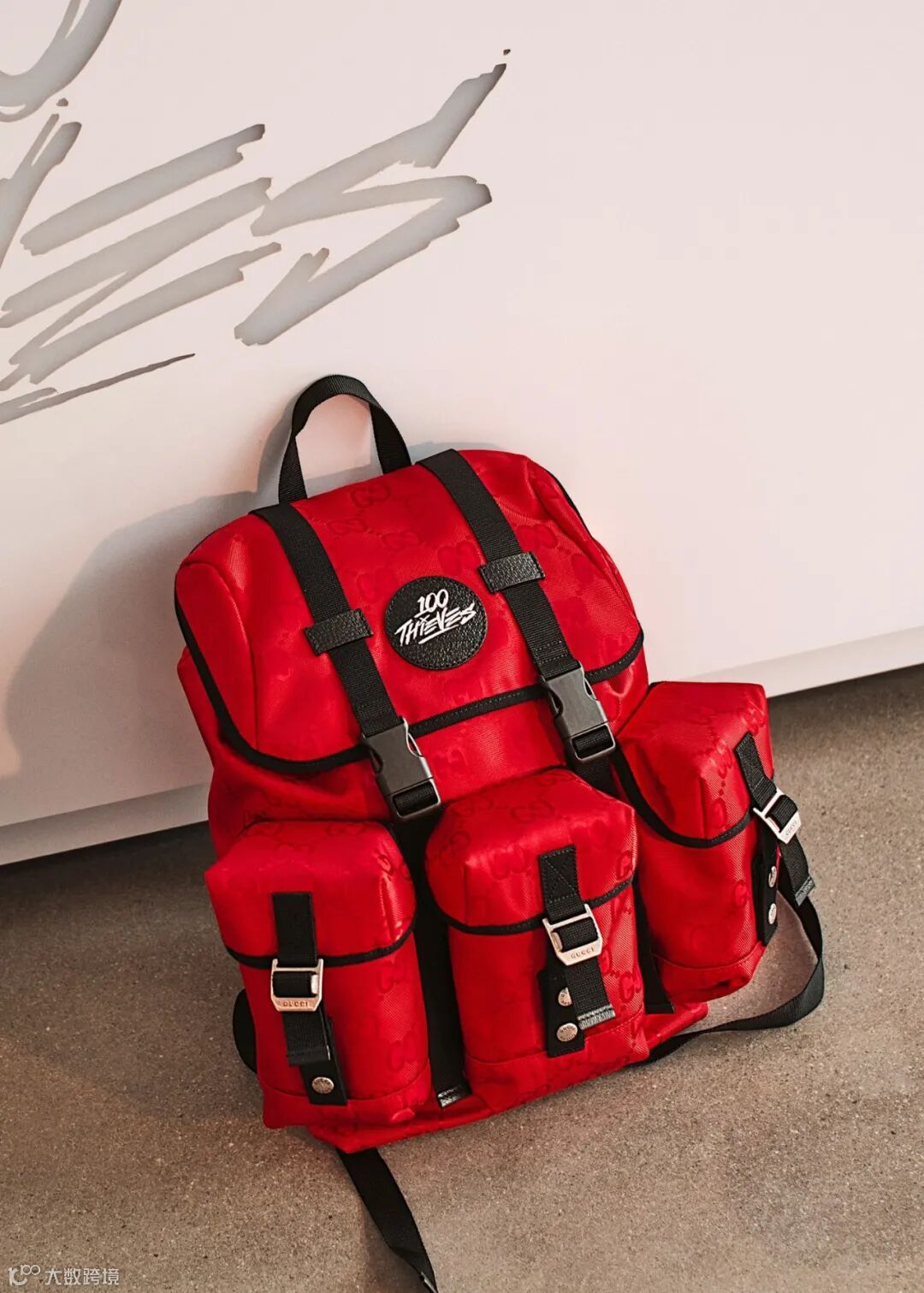 为庆祝这一强强联合,品牌推出GUCCI Off The Grid系列特别版背包,采用来自可持续来源的可回收材料制作而成,以全新亮红色设计搭配饰有100 Thieves标识的别致圆形贴饰。