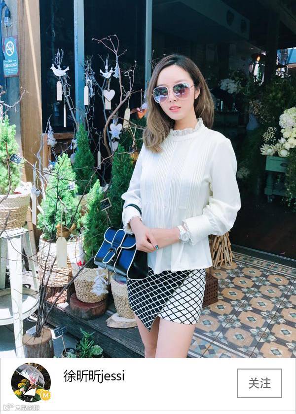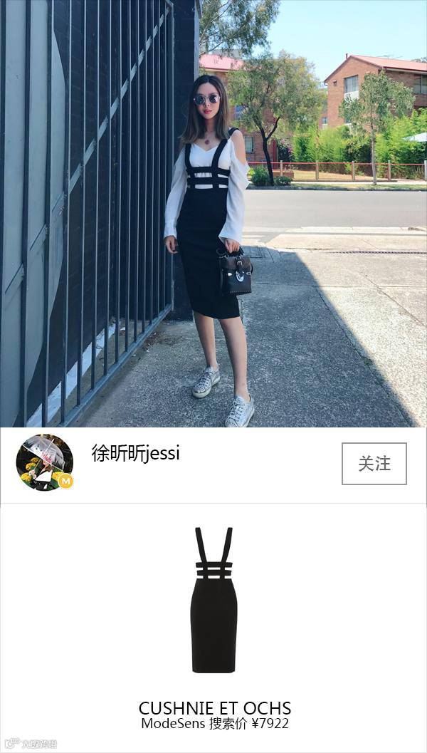 @徐昕昕Jessi坚持一贯的搭配风格,就爱黑色和白色,就凭两种颜色照样可以搭出多种look。颜色不够突出,就要靠款式取胜,设计独特的背带裙和漏肩白色内搭,一套青春活力减龄look完成。