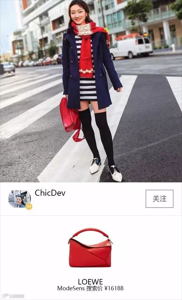 和徐昕昕不同, @ChicDev喜欢尝试不同的颜色,尤其是配饰,这身包包和围巾都是很跳的红色,鞋子、袜子和条纹的内搭也是相互搭配的。
