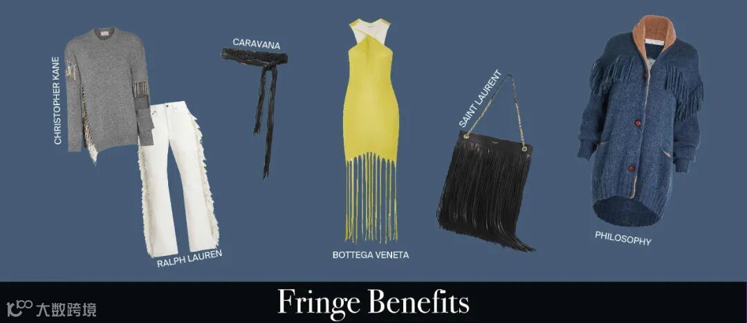 设计师们在这一季中不约而同的选择了流苏元素。用Bottega Veneta的流苏裙来完美塑造70年代的风格,或者用Saint Laurent的流苏包或Caravana的流苏腰带来点点缀你的时髦造型。无论你的风格如何,流苏都是一个很好时髦元素。