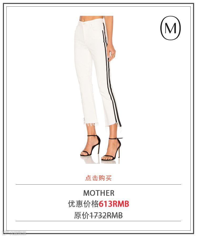 MOTHER十分擅长各式各样的喇叭裤,其中Insider高腰牛仔裤最受欢迎。而不规则剪裁的裤脚则是它的看家本领,一点点的时髦小细节让它看上去精致又时髦。这样的设计还有一个让人无法拒绝的好处:显腿长!微喇的款式可以搭配任何上装和鞋子,可优雅可俏皮。