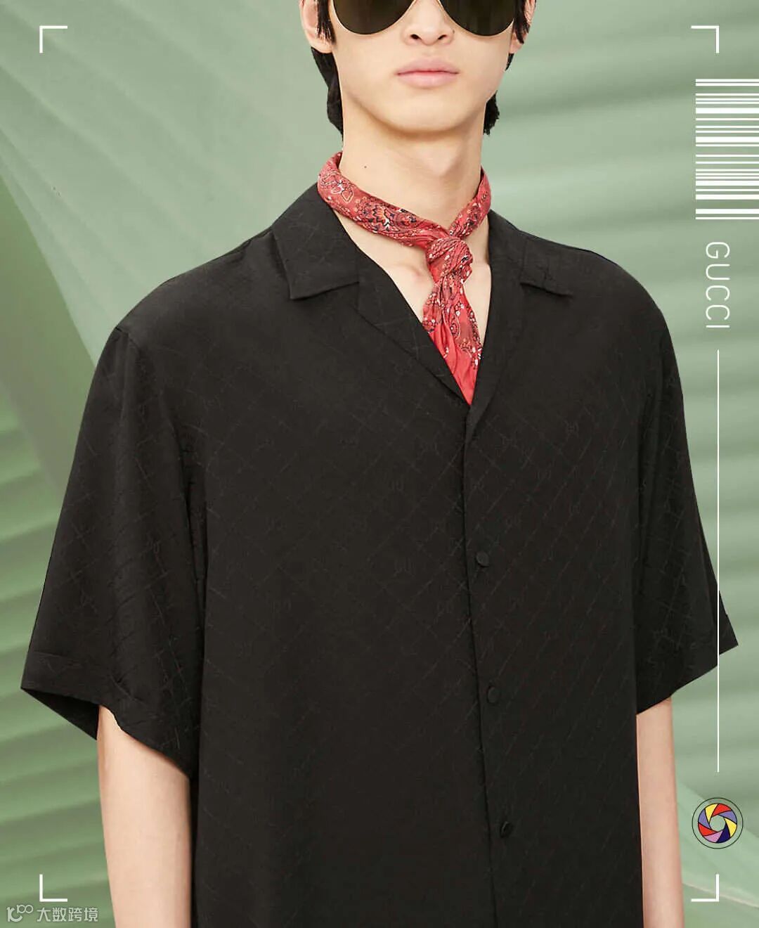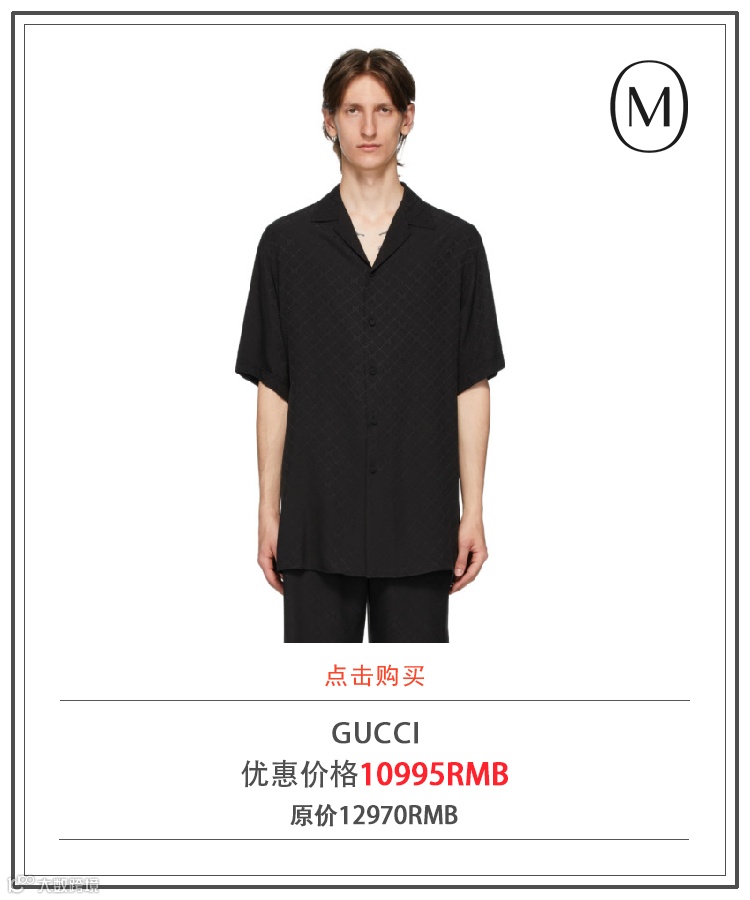 黑色不一定枯燥无味,就像这件GUCCI衬衣。同样采用了时下最为流行的古巴领设计,配合真丝提升质感的同时保证了夏日穿着的舒适性。若隐若现的Logo印花也充满辨识度,低调奢华首选。