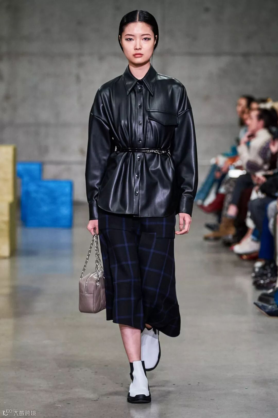 19秋冬大秀上的这件皮衬衣廓形宽大,胸前缝有单只口袋。不妨配搭羊毛或真丝单品,大胆玩转材质对比。