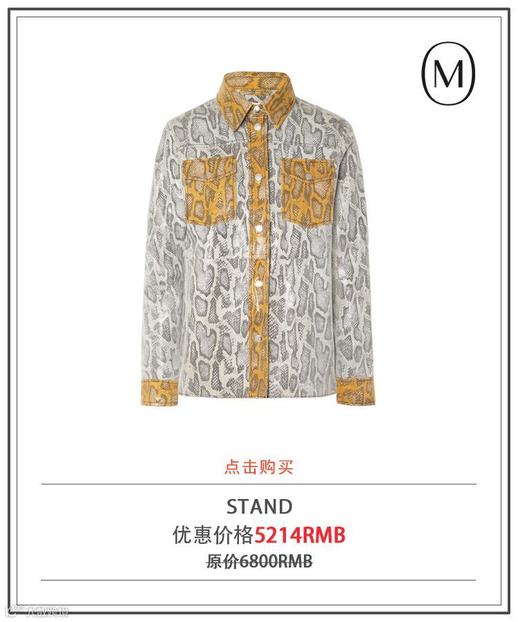 STAND由Nellie Kamras创立,在创建品牌前家族从事皮革行业已有 35 年,可以说她与皮革有着不解之缘,所以开创个人品牌STAND时,也自然而然地选择了这一面料。这款仿蛇纹衬衫以格外柔滑的皮革制成,设有亲肤的拉绒背衬。领口、贴袋和袖口处抢眼的芥黄色调十分别致。内搭简洁的坦克背心,敞开穿也是不错的选择。