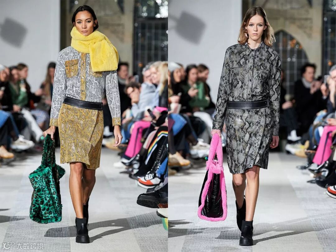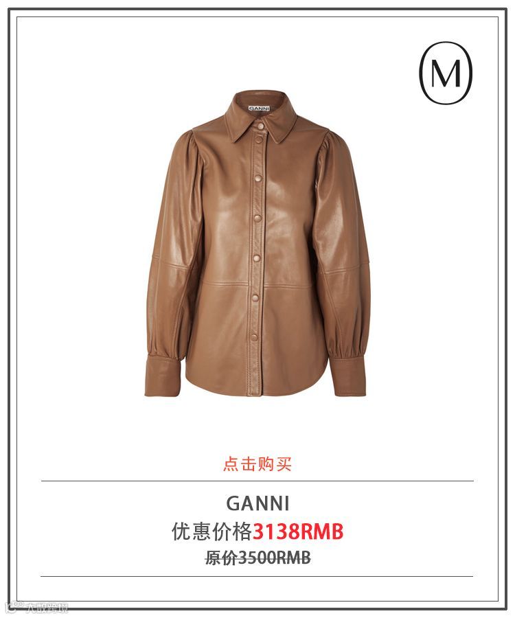 皮衬衣甚至从宇宙大网红GANNI 2019秋冬秀场上一直蔓延到了2020春夏。从奢华皮革材质、中性色调,再到样式别致的双袖设计,GANNI FALL 2019秀场上这款衬衫接连命中 2019 秋冬季的三大潮流靶心。单品肩部和袖口的缩褶则引出丰盈的泡泡袖。