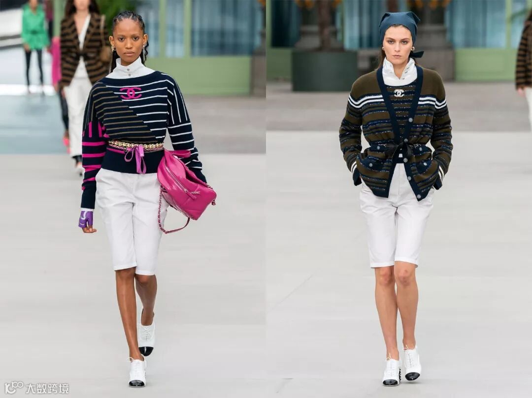 CHANEL秀场上的经典纯色百慕大短裤配上经典的条纹元素,颇有上世纪80年代VOGUE大片的感觉。