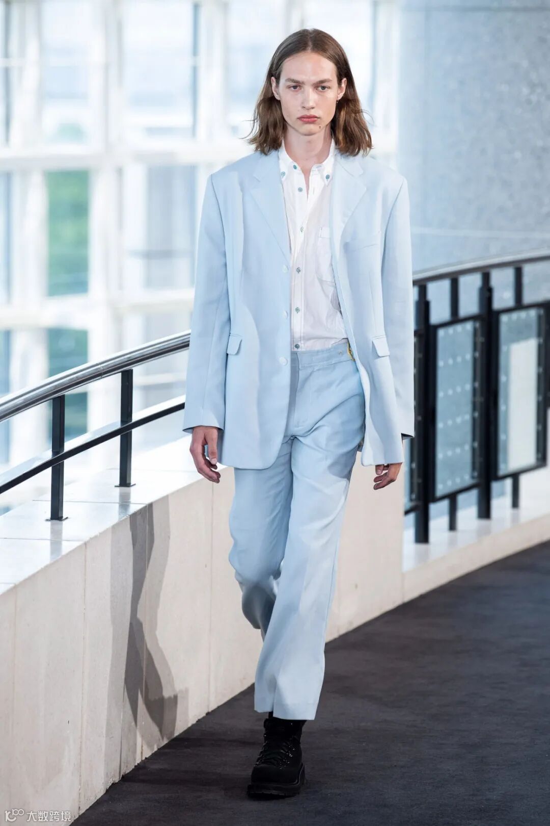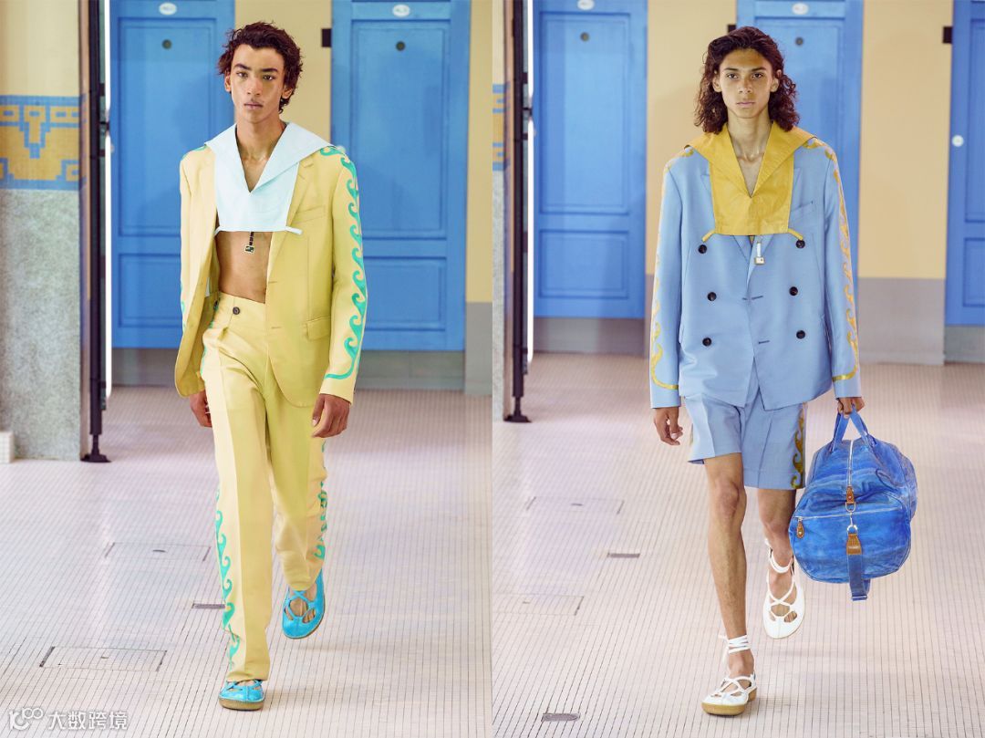 有态度的时髦男孩子一定不能错过粉笔色套装。前面说过蓝色是广大男同胞最容易接受也最适合尝试的颜色。内搭白衬衫或T恤分清主次。明确穿搭亮点。黑色的鞋子能够平衡单色造型的轻佻感。