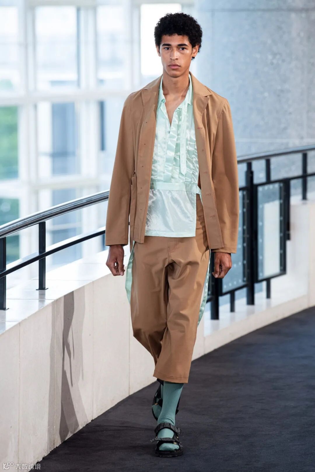 初试粉笔色最保险的方法还是从内搭开始。在穿着夹克或是西装外套时选用粉笔色单品作为内搭。小面积的露出色块绝不会出错。冰蓝色+卡其色、西瓜色+灰色。都是很好的配色方案。同时细节上的处理会让整体造型更加完整统一,很简单的方法就是选用与内搭相同色系的袜子进行呼应。