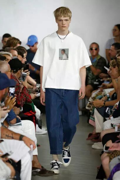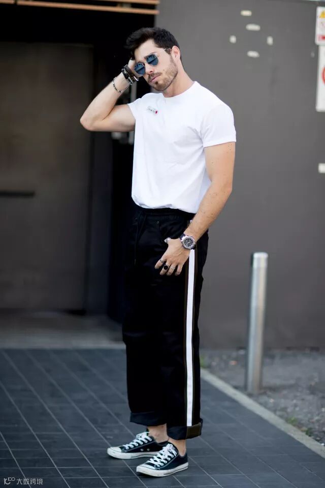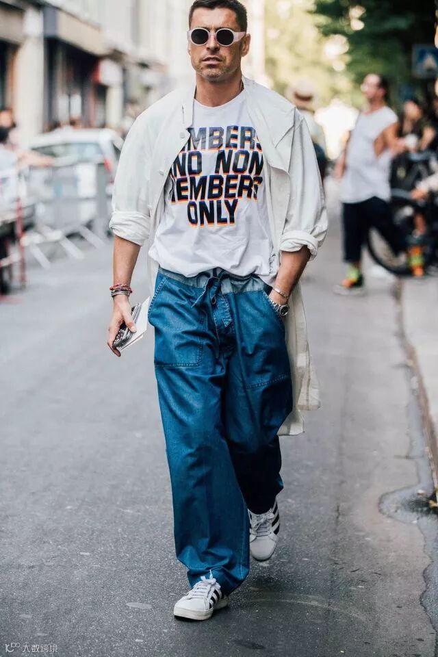 选择T恤+牛仔裤的穿法没错,但在挑选牛仔裤的时候其实可以在裤型上多下点心思。比如,不要以为阔腿牛仔裤只是女生们的专利,男士也可以穿,而且和T恤搭配的效果更潮更有活力。