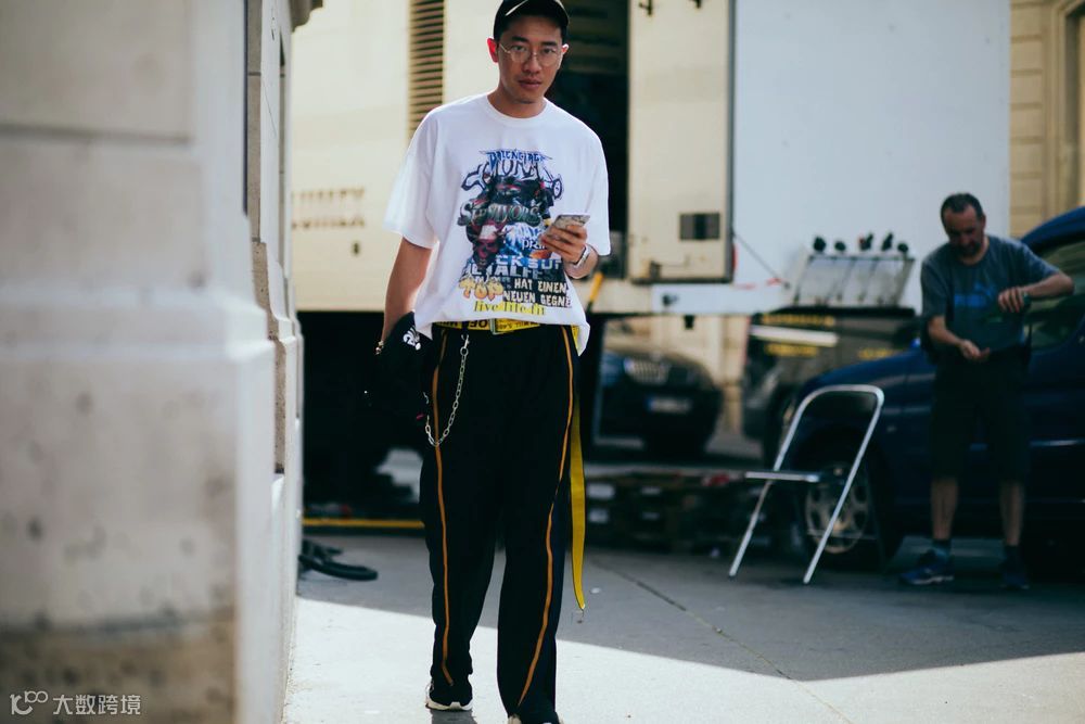T恤纯色度越高,图案越少,下身裤装的花样就越多。不论是链条,破洞,或是花纹,都能很好的为整体look增色,打破纯色T恤的死板单一感。