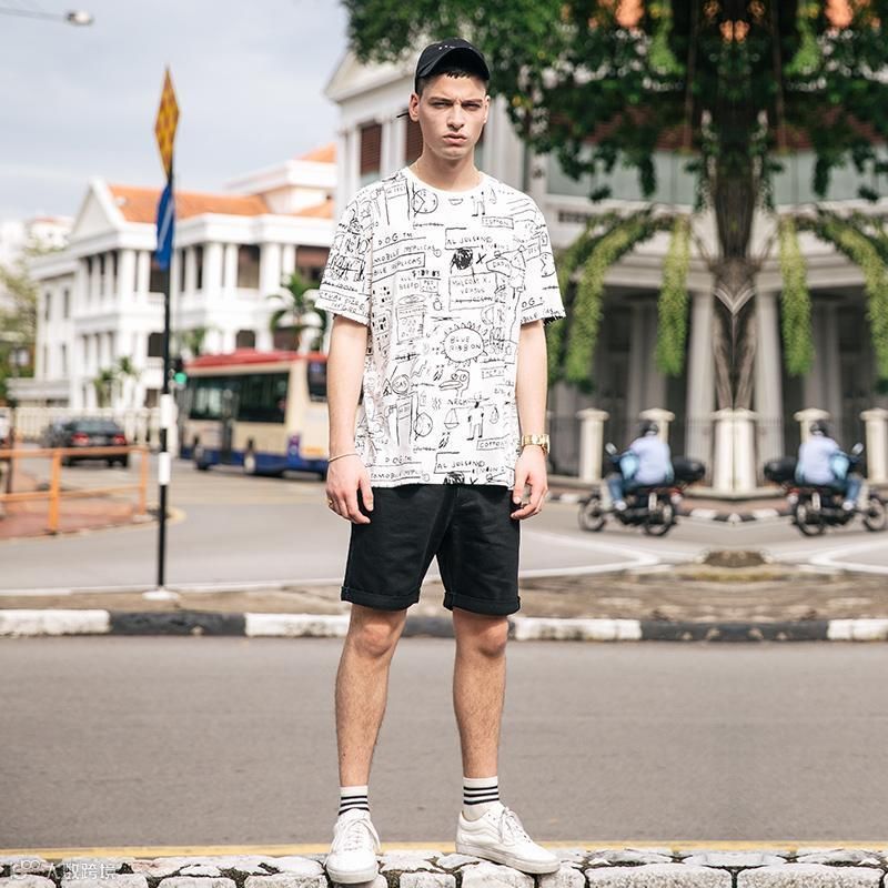 T恤纯色度越低,图案越多,下身裤装的花样就越少。尤其是T恤上出现大片人像、风景等图案,下身的裤装多以纯色为主。避免与上半身比较多的色彩出现冲突而导致让人眼花缭乱。