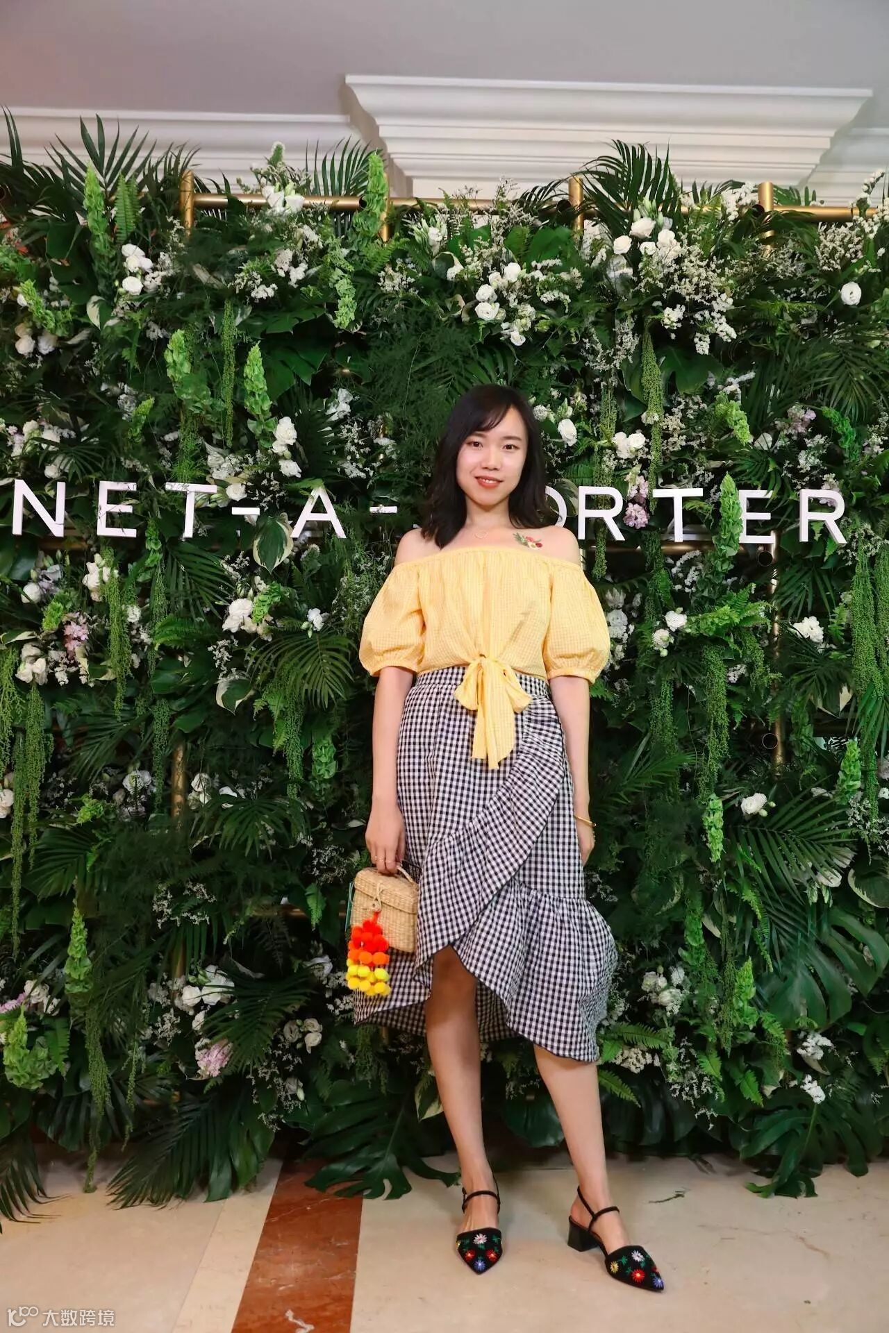 特地从成都飞过来的ModeStar @圆圆儿圆 选择了本季大热的Gingham小格子为当日搭配重点,用Off-shoulder一字落肩短上衣,搭配大荷叶边半身裙,明黄色与海军蓝色对撞,加上本季绝对的大热单品NANNACAY球球草编小包,百分百切合主题,一眼便知她心中的度假胜地一定是热带小岛。