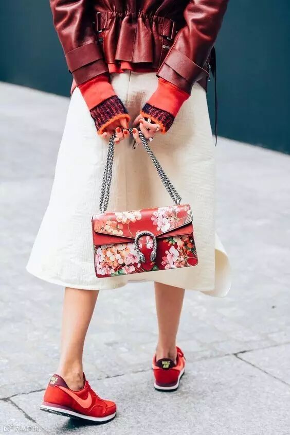 本来很容易俗气的花朵图案,碰上鲜艳的红色可以这么美的就只有GUCCI了,包包和上衣鞋子的红色元素搭配的恰到好处。