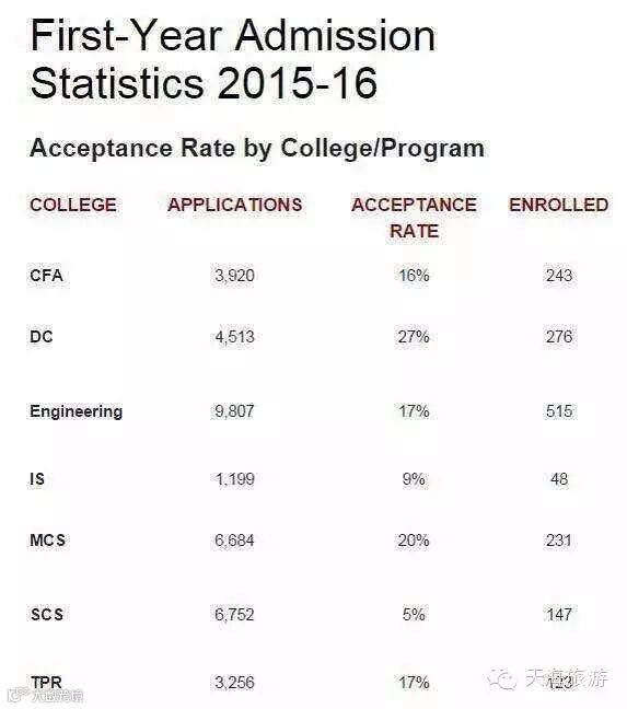 普遍的学生除了申请SCS,还有申请Tepper,录取率在17%左右,工程学院也非常好17%,剩余的学生申请科学学院,录取率在20%左右。