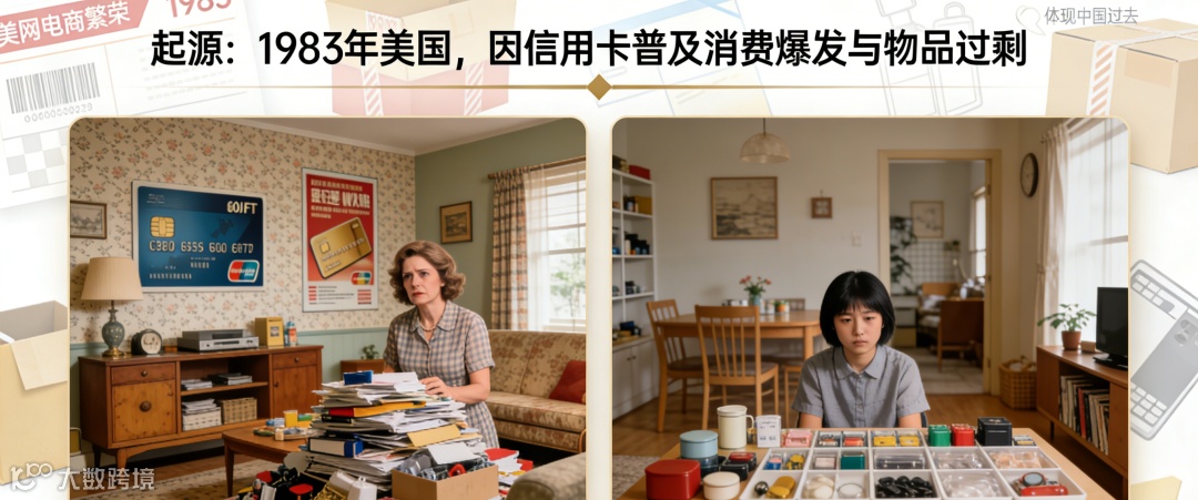 并非源于日本,而是1983年始于美国,直接诱因是信用卡普及带来的消费大爆发与家庭物品过剩。