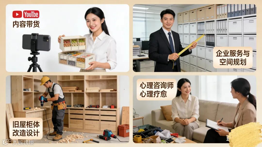 在美国,已衍生出四大模式——内容带货(YouTube博主)、企业服务与空间规划(服务高盛等大公司)、改造设计(旧屋柜体改造)、心理疗愈(针对囤积症)。