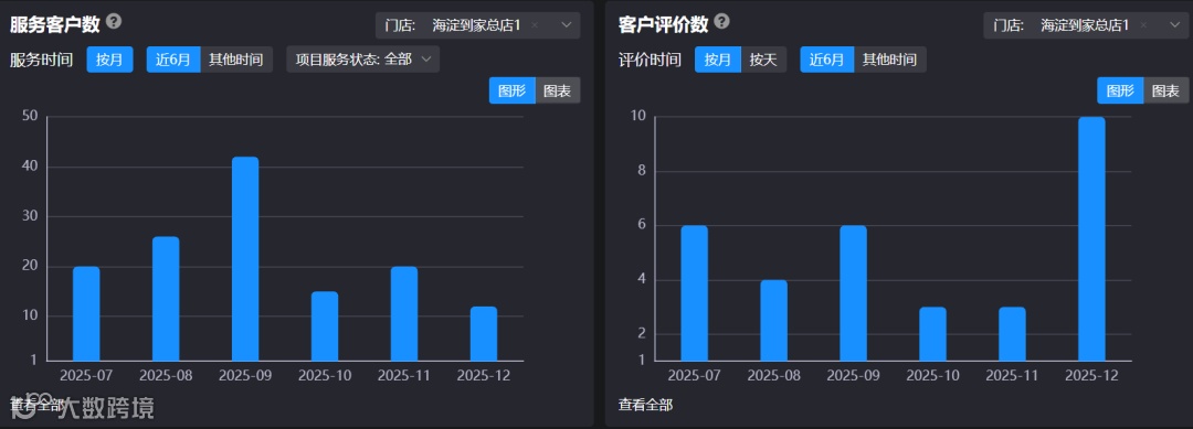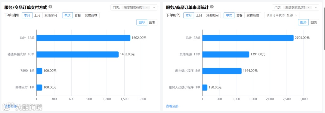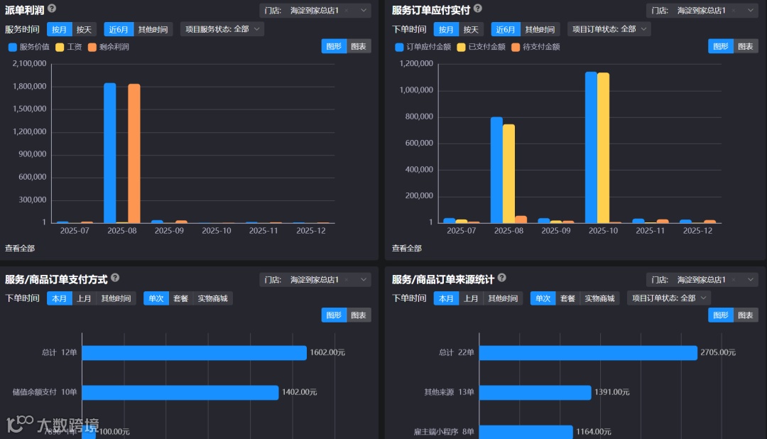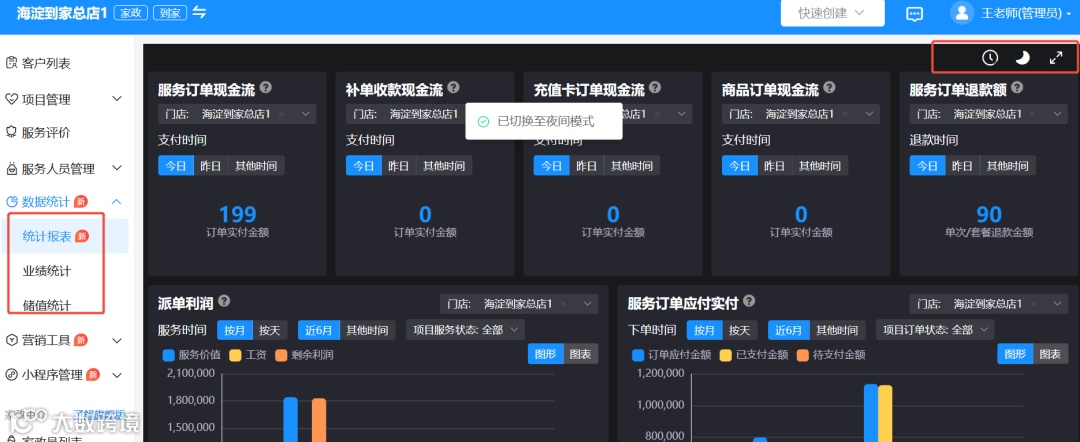 以前那些模糊的问题,现在有了明确的答案。在 【到家业务】 下的 【数据统计】 模块里,各项关键指标被清晰地呈现出来。