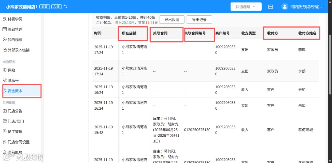 PC端收银宝收支流水新增“收付方”、“收付方姓名”列:展示收款方/付款方的客户/家政员名称;
