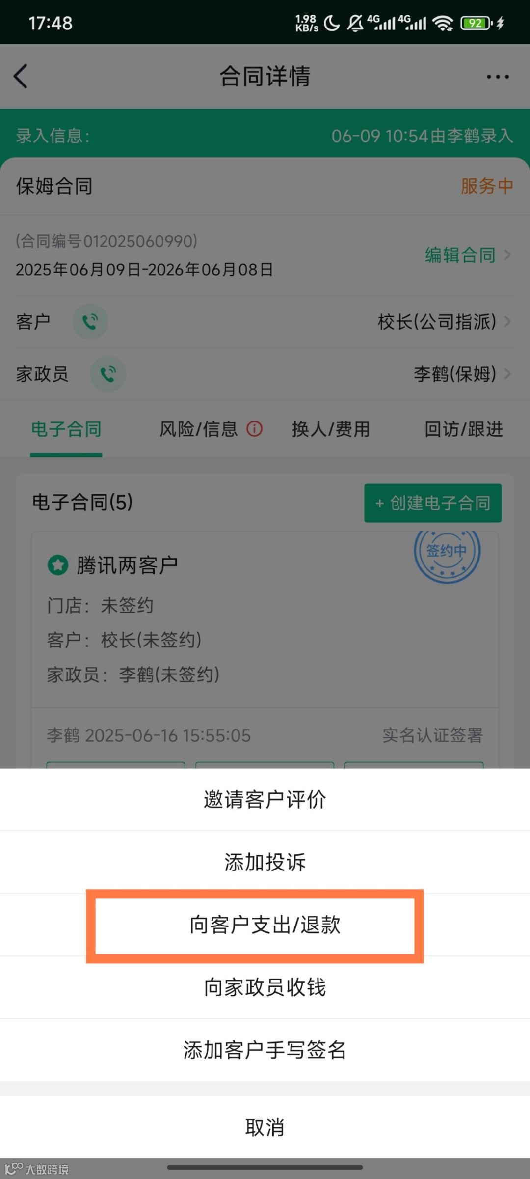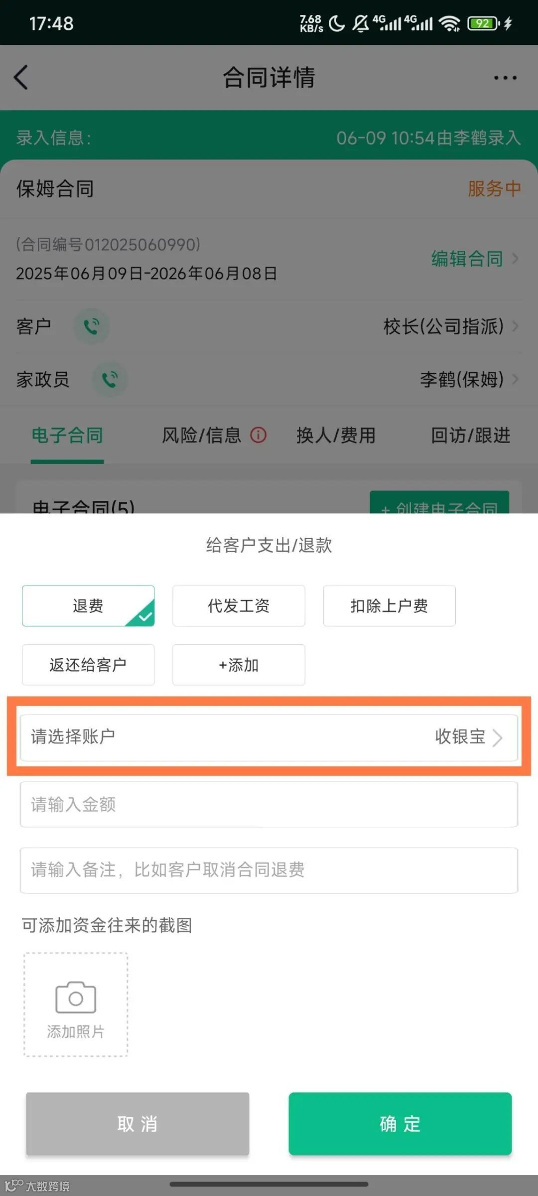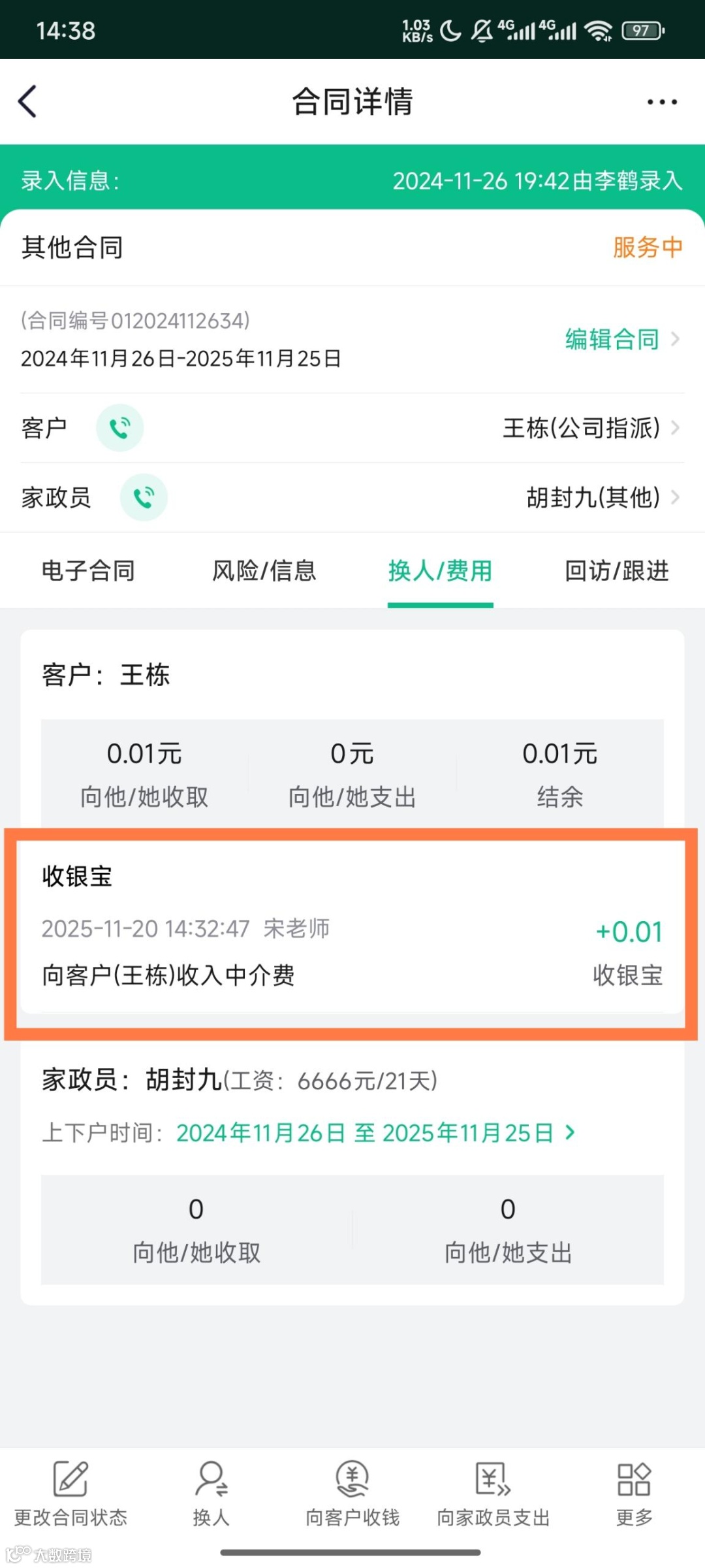 支持在合同中直接向客户、家政员收款,可直接通过收银宝转账,相关信息自动同步生成合同收支记录。