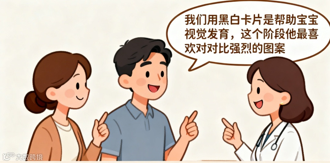 比如可以这样说:“我们现在给宝宝看黑白卡片,是为了帮助他的视觉发育。这个阶段的宝宝最喜欢对比强烈的图案了。”