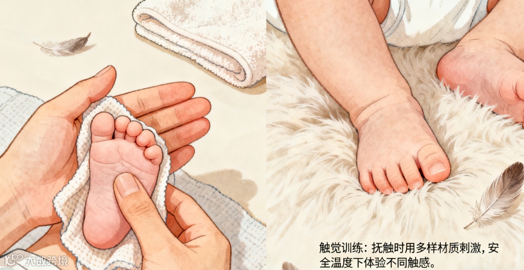 触觉训练可以贯穿在日常护理的每个环节。给宝宝做抚触时,不仅是单纯的手法操作,更是宝贵的触觉体验时光。